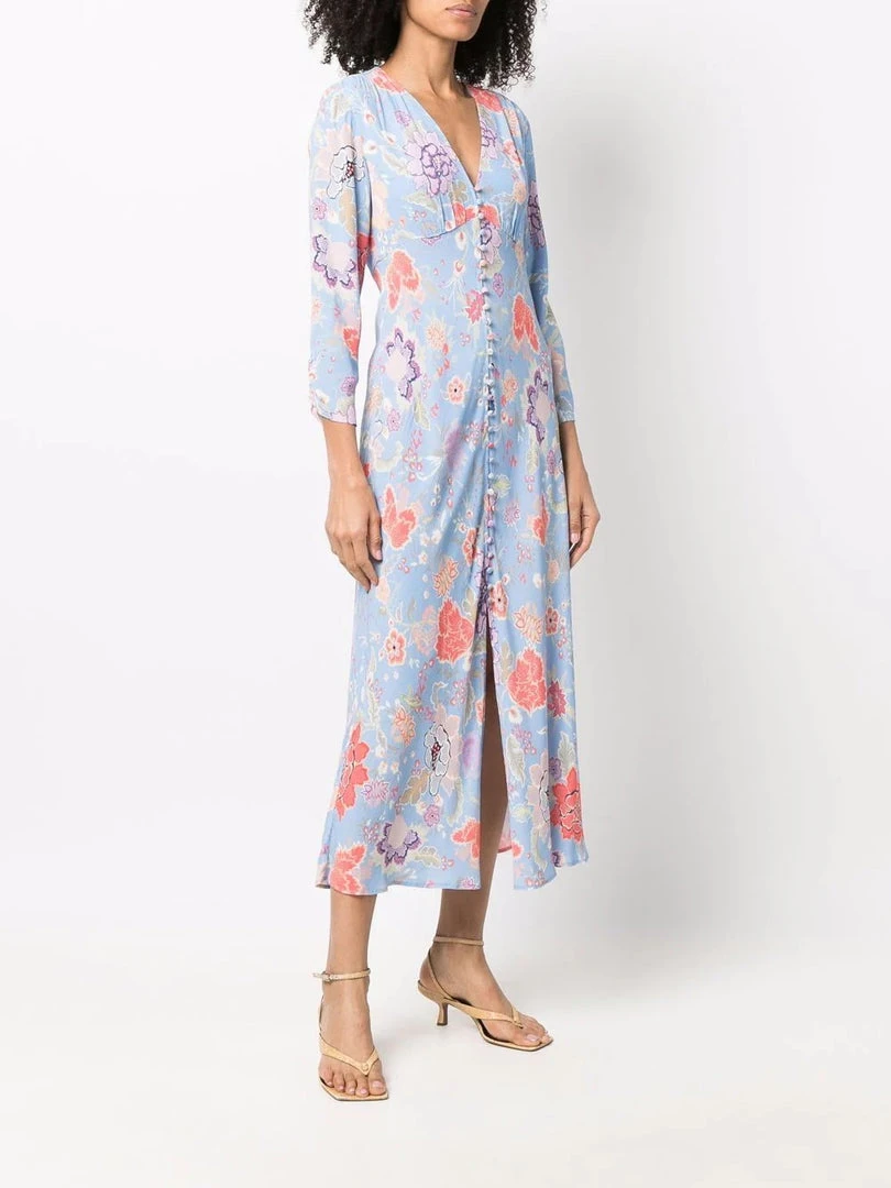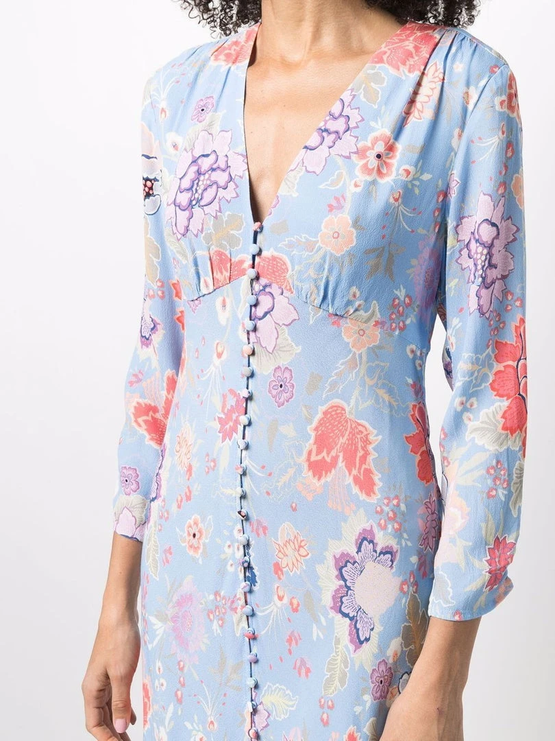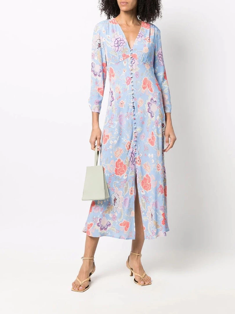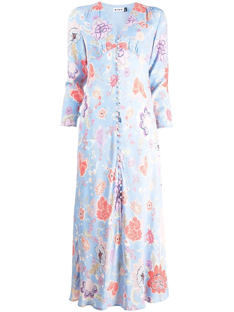 Rixo baby blue ‘Katie’ peony floral midi dress featuring a V-neckline, long sleeves with ruched cuff details, front button and loop fastenings, a concealed side zip closure, an empire waistline, a multicoloured peony floral print and a midi length. Item fits true to size. Model is wearing a size S.Â