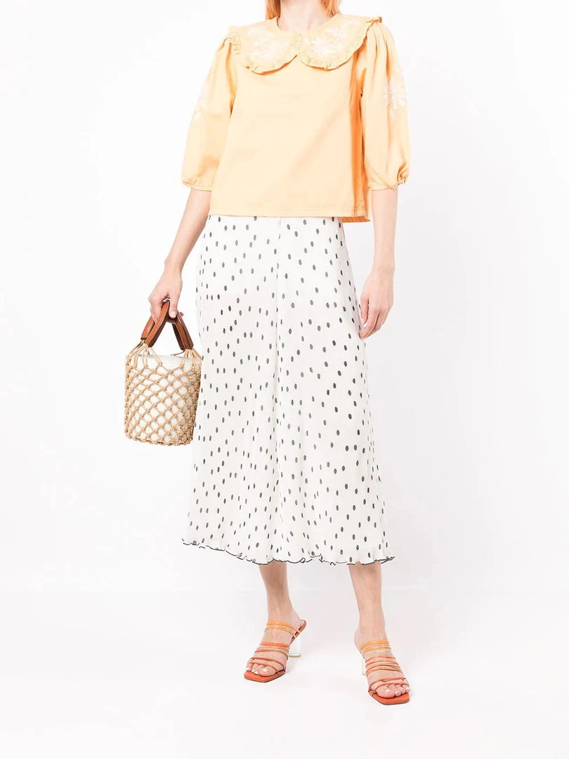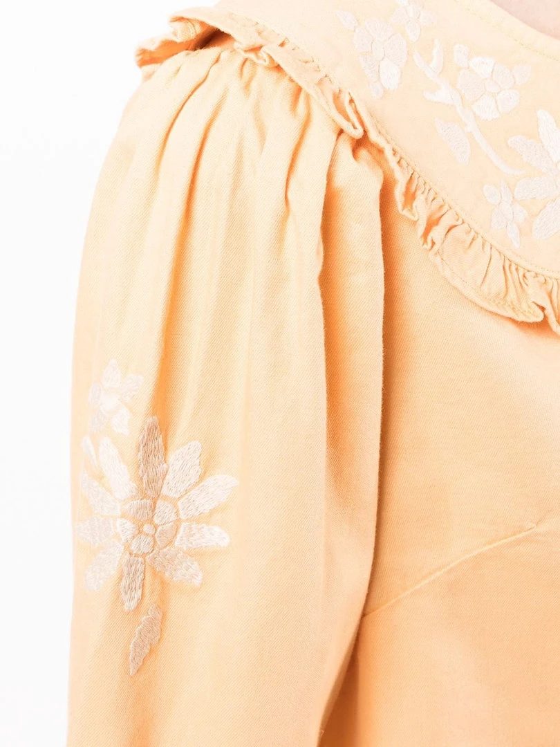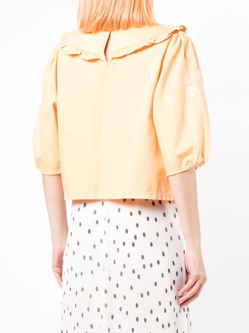 Rixo light peach ‘Lianna’ embroidered denim blouse featuring an oversized ruffle collar, a back button fastening, three-quarter length sleeves, white floral embroidered details and a straight hemline. Item fits true to size. Model is wearing a size XS.Â