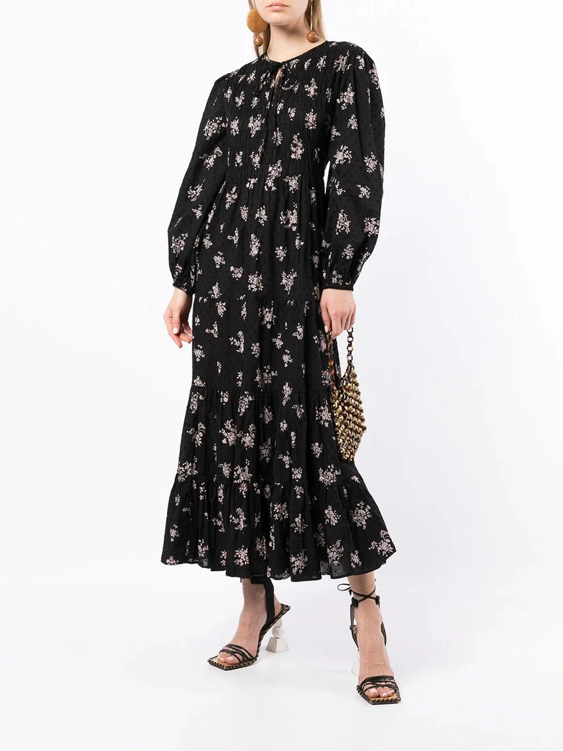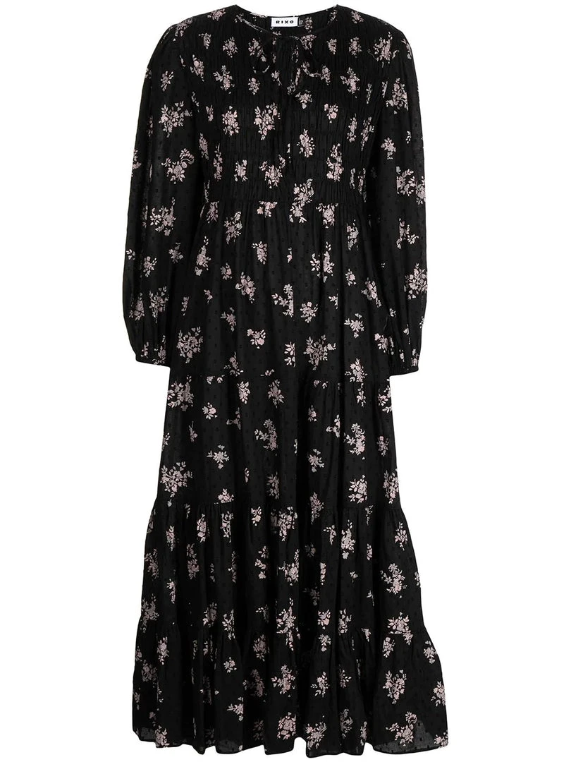 Rixo black ‘Lori’ floral bunch midi dress featuring a round neckline, a front tie detail, long sleeves with elasticated cuffs, a shirred top, a tiered skirt, a pink floral bunch print, black embroidered polka dot detailing, a midi length and pulls on. Item fits true to size. Model is wearing a size XS.Â