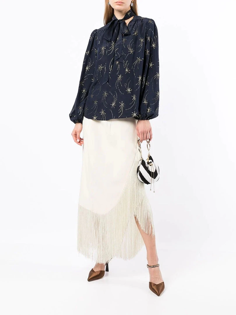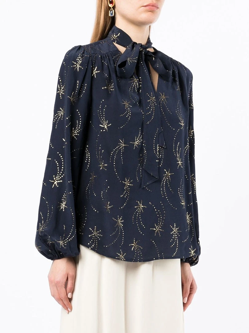 Rixo London navy ‘Moss’ star glitter blouse featuring a V-neckline with a pussy bow detail, long sleeves with elasticated cuffs, a curved hemline, a silver glitter shooting star print on sheer fabric and pulls on. Item fits true to size. Model is wearing a size XS.