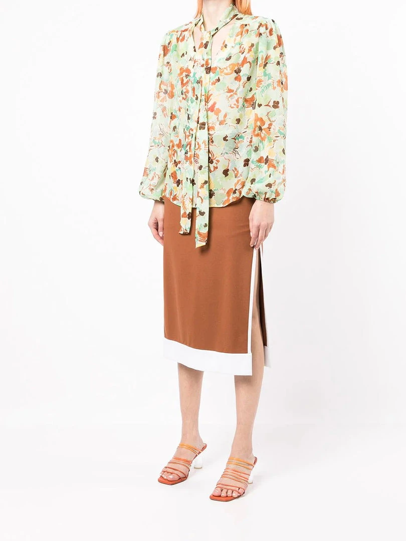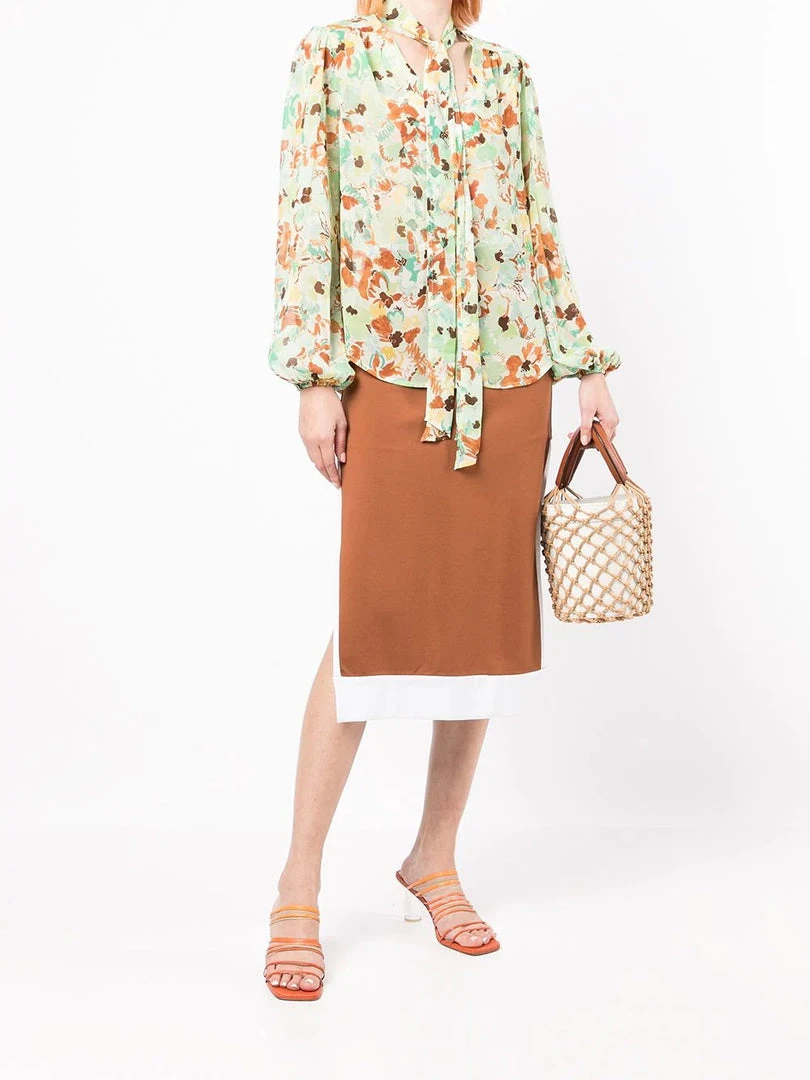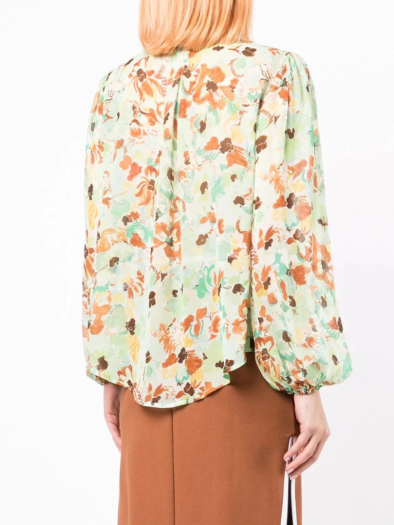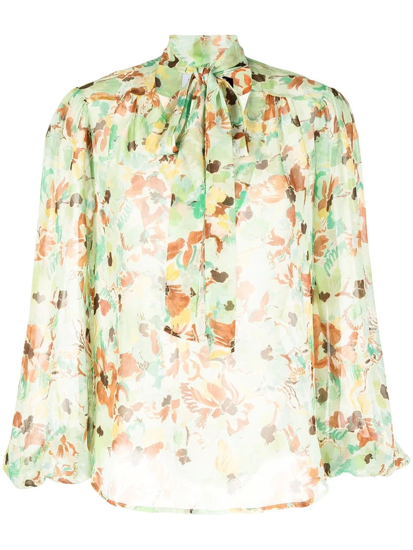 Rixo mint green ‘Moss’ sheer pussy bow floral blouse featuring a neck tie detail, a V-neckline, long sleeves with elasticated cuffs, a curved hemline, a multicoloured camouflage floral print and pulls on. Item fits true to size. Model is wearing a size XS.Â