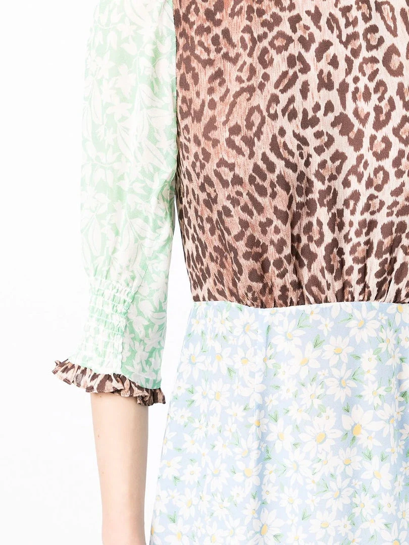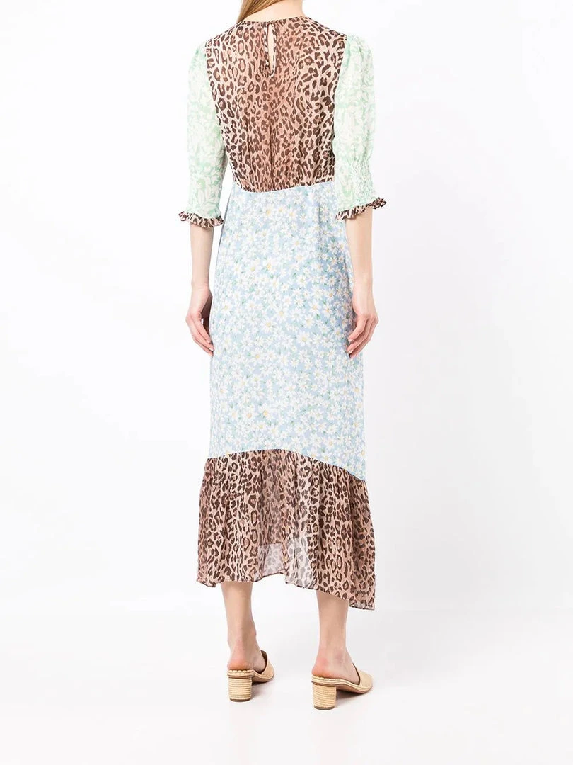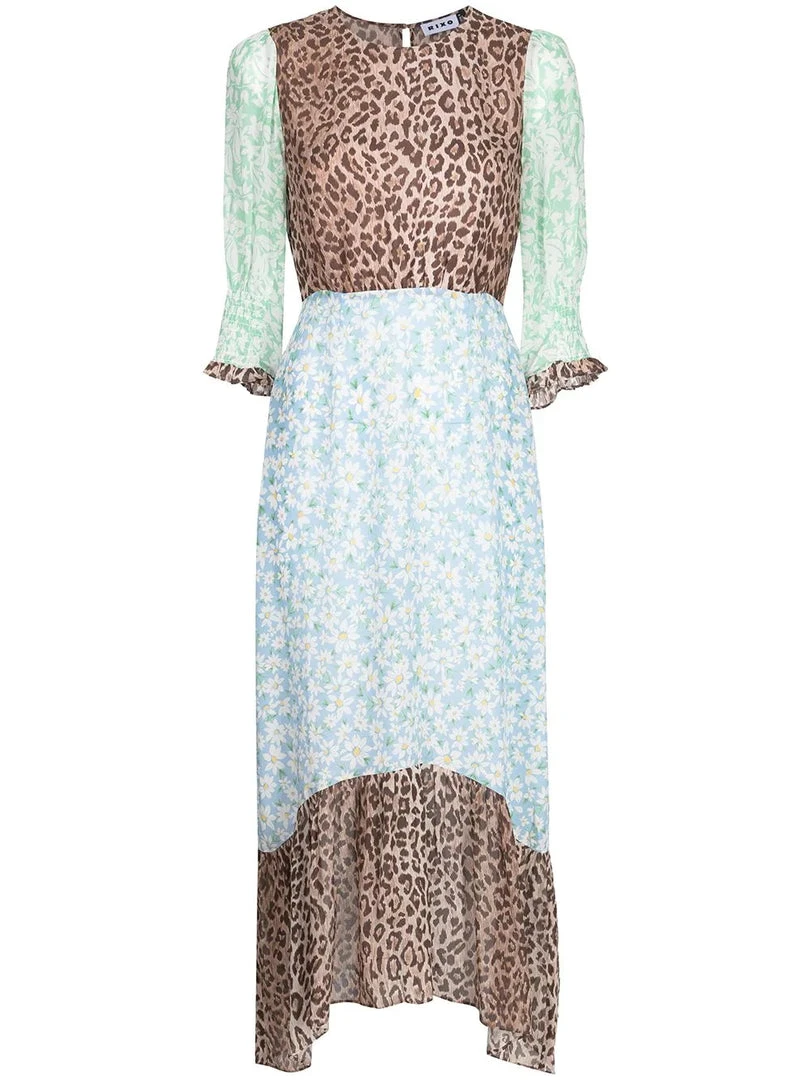Rixo ‘Saffron’ floral leopard midi dress featuring a round neckline with a back button closure, three quarter length sleeves with elasticated panels, a side zip fastening, contrasting leopard and multicoloured floral prints, a ruffled hemline and a midi length. Item fits true to size. Model is wearing a size XS.Â