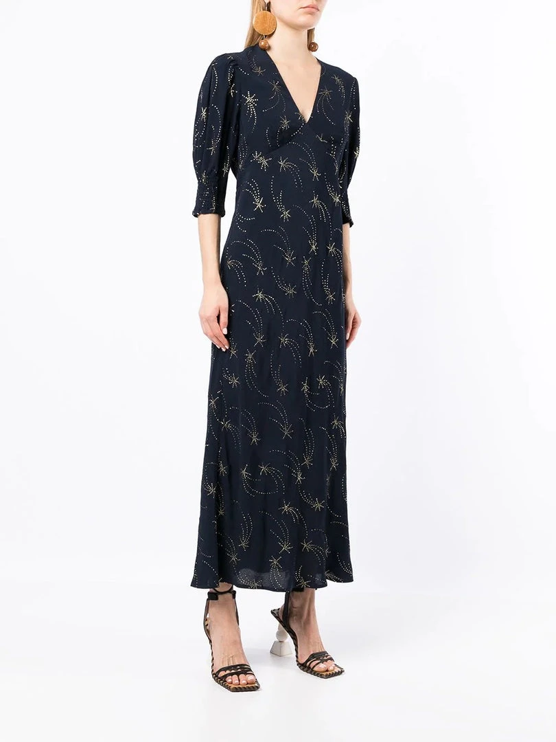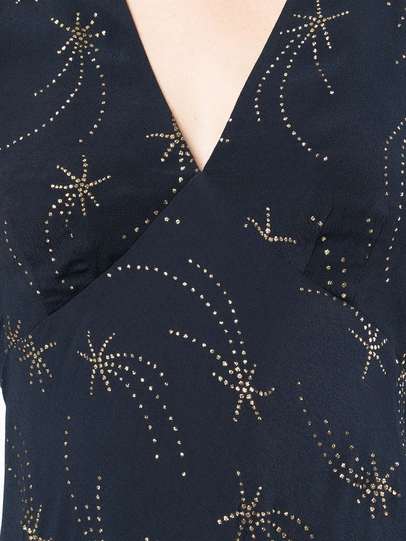 Rixo navy ‘Zadie’ glitter star midi dress featuring a V-neckline, short sleeves with elasticated cuffs, a side zip fastening, an empire waistline, a gold glitter shooting star print and a midi length. Item fits true to size. Model is wearing a size XS.Â