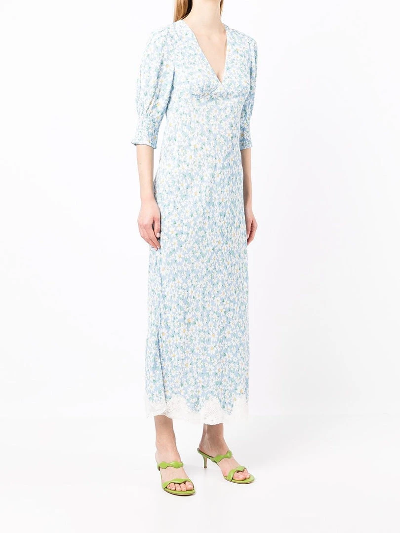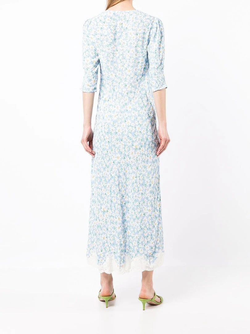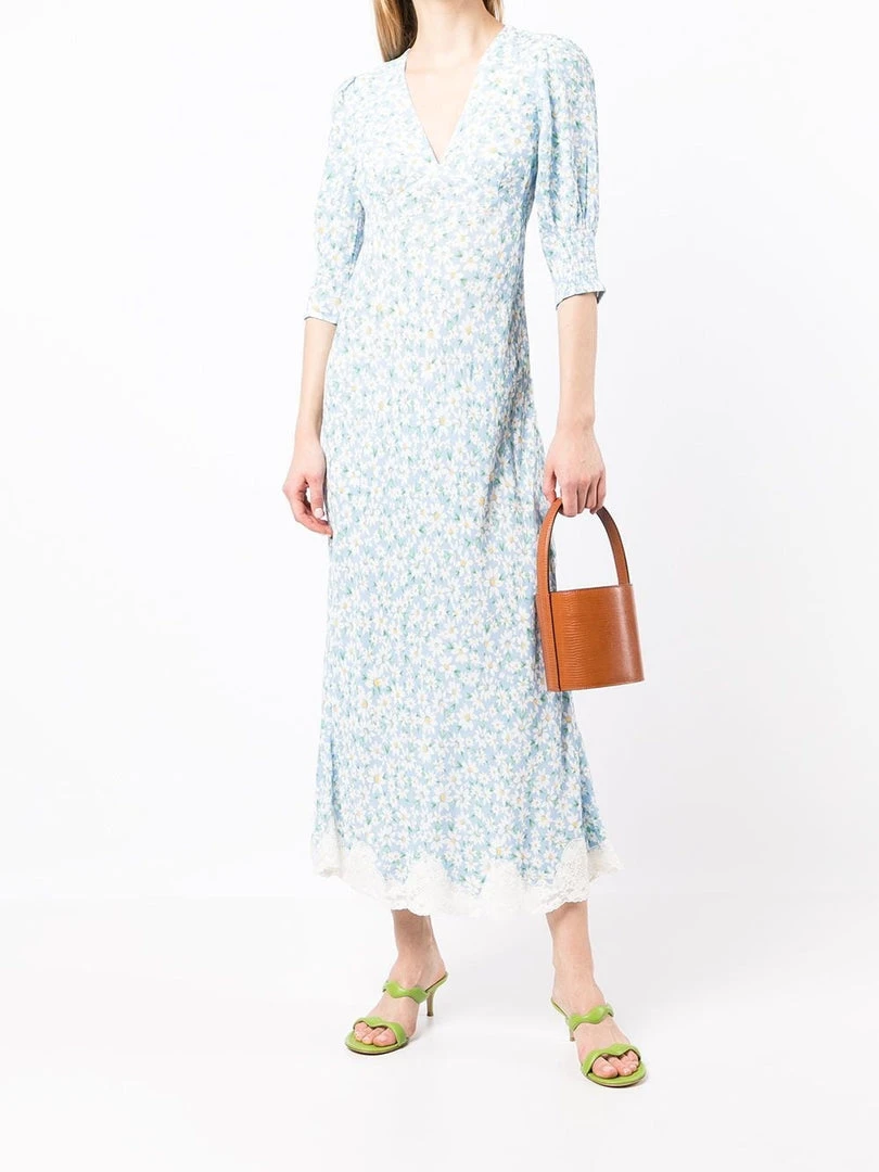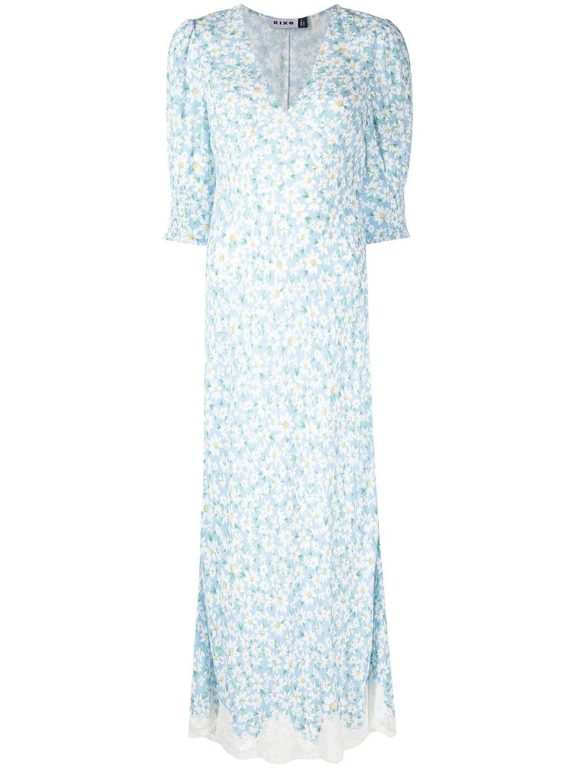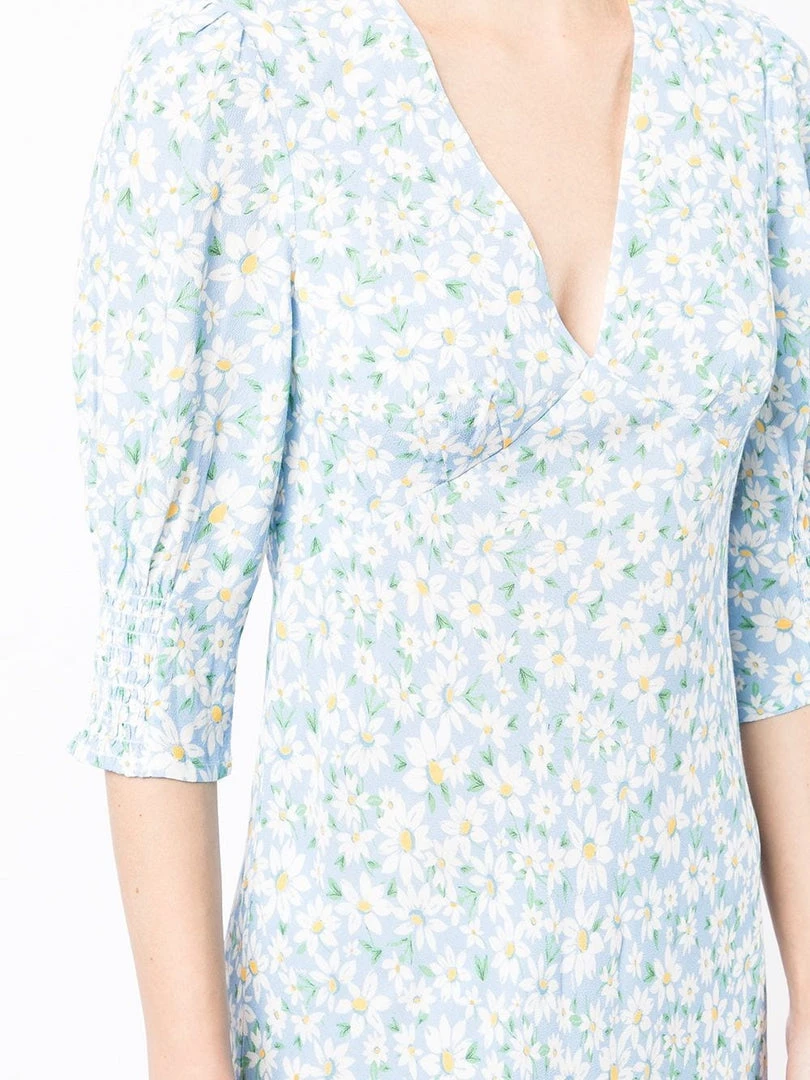 Rixo blue ‘Zadie’ midi dress featuring a V-neckline, short sleeves with elasticated panels, an empire waistline, a side zip fastening, a printed design and a midi length. Item fits true to size. Model is wearing a size XS.