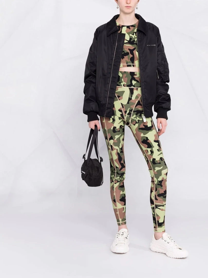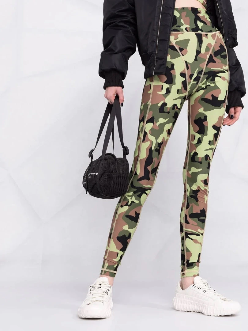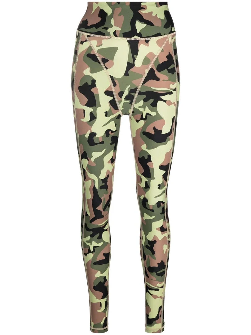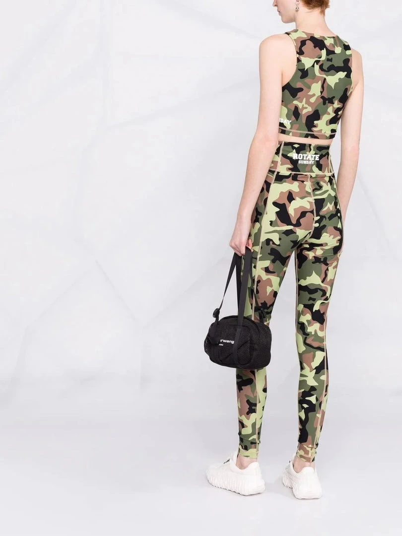 Rotate Sunday ‘Ronda’ camo leggings featuring an elasticated waist, a white brand logo design on the back, beige stitching details, a green camouflage print, a high waist style and pulls on. Item fits true to size. Model is wearing a size S.Â