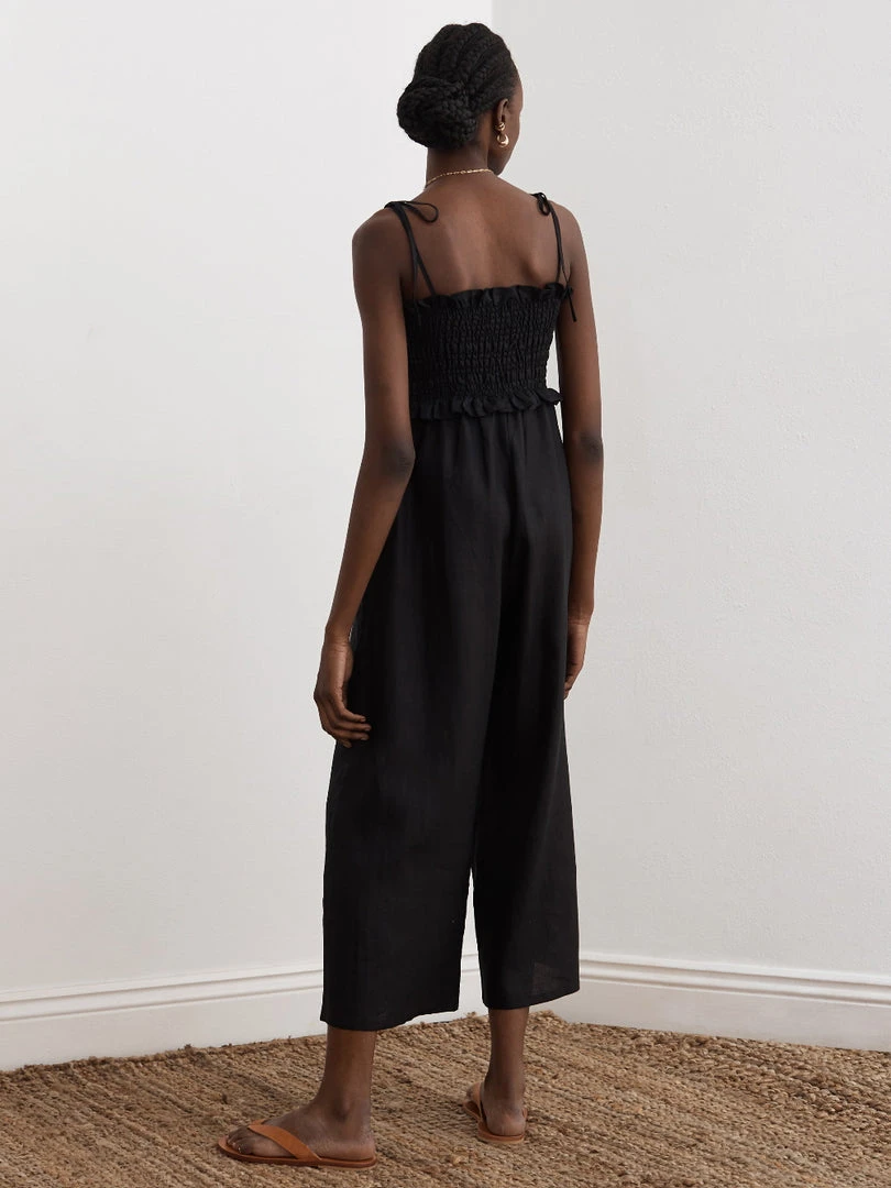 Sancia black ‘Aerin’ jumpsuit featuring adjustable tie straps, a shirred top with ruffle trimming, side slip pockets, a wide leg fit and pulls on. Item fits true to size. Model is wearing a size XS.