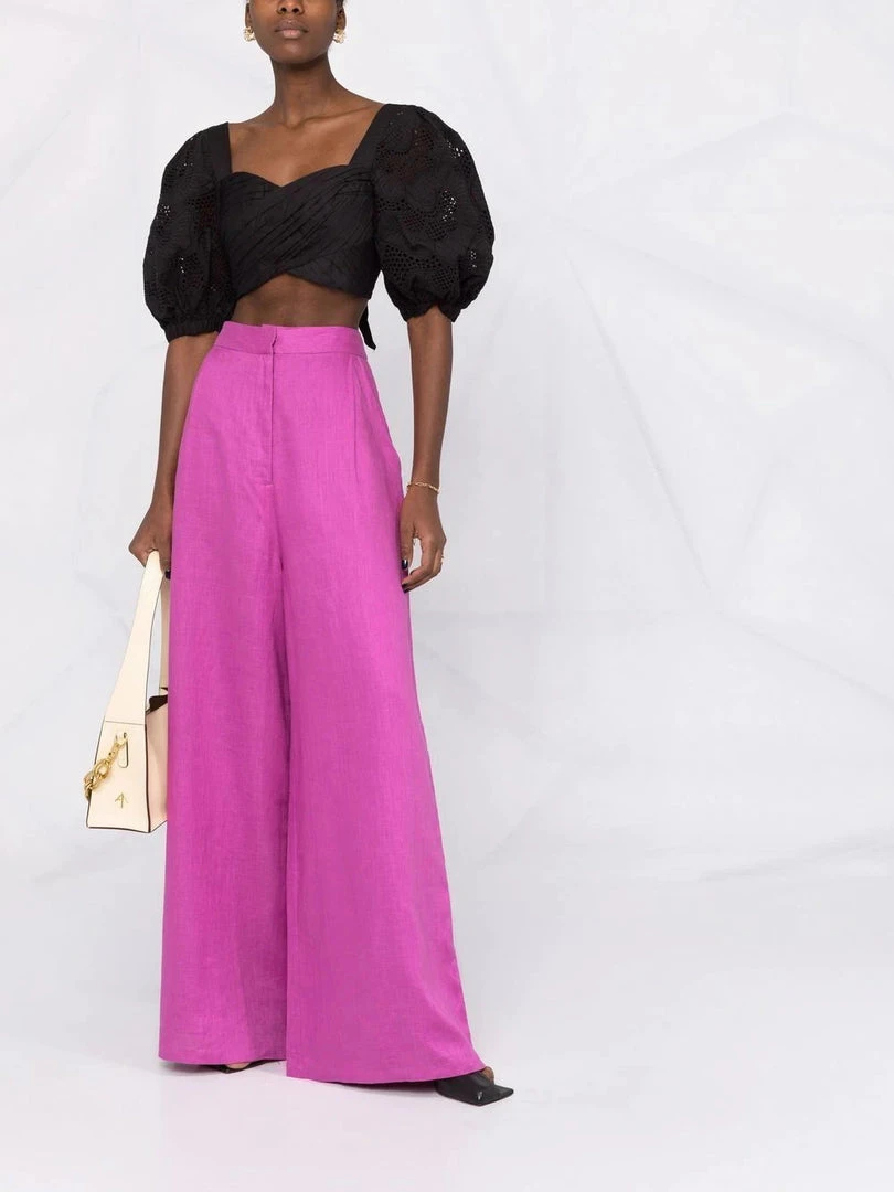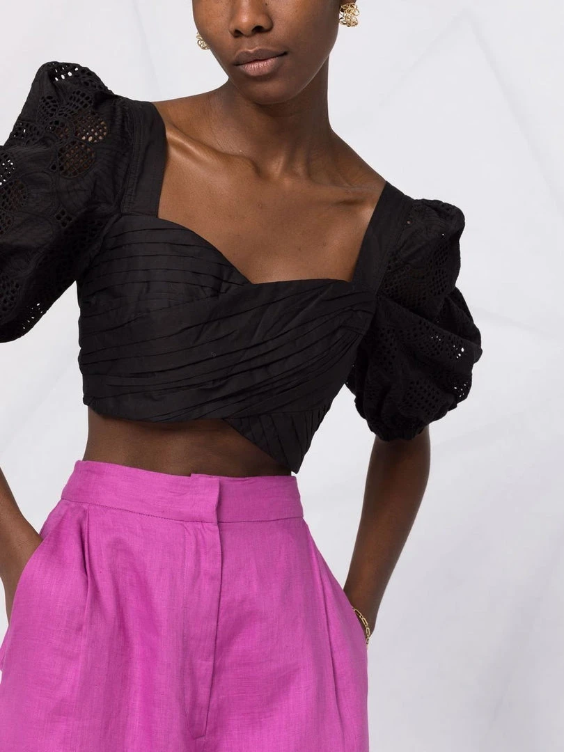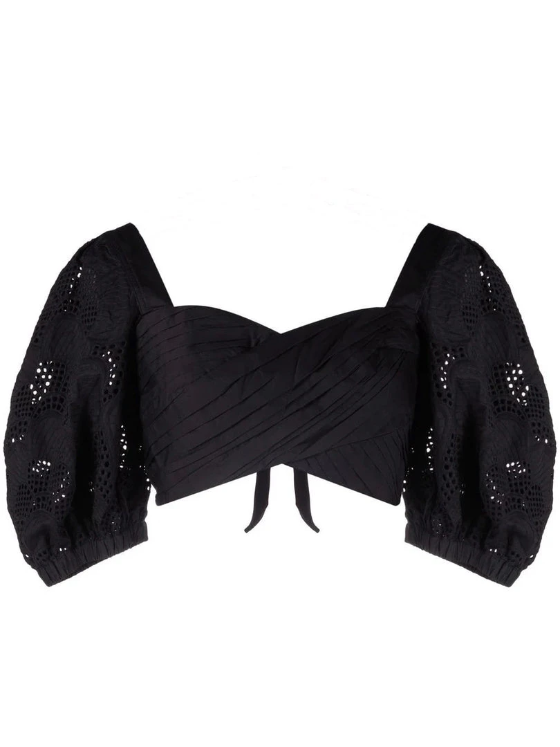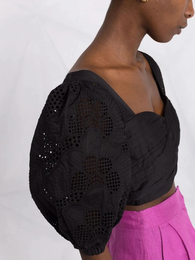 Self-Portrait black ‘Embroidered Puff Sleeve Crop Top’ featuring a sweetheart neckline, short puff lattice floral embroidered sleeves with elasticated cuffs, a pleated cross-over design, a back tie fastening and a cropped style. Item fits true to size. Model is wearing a size 8 UK.