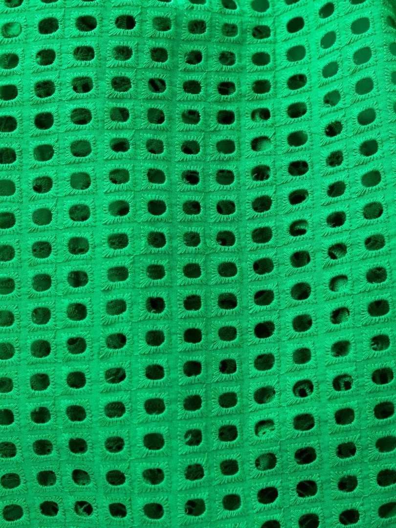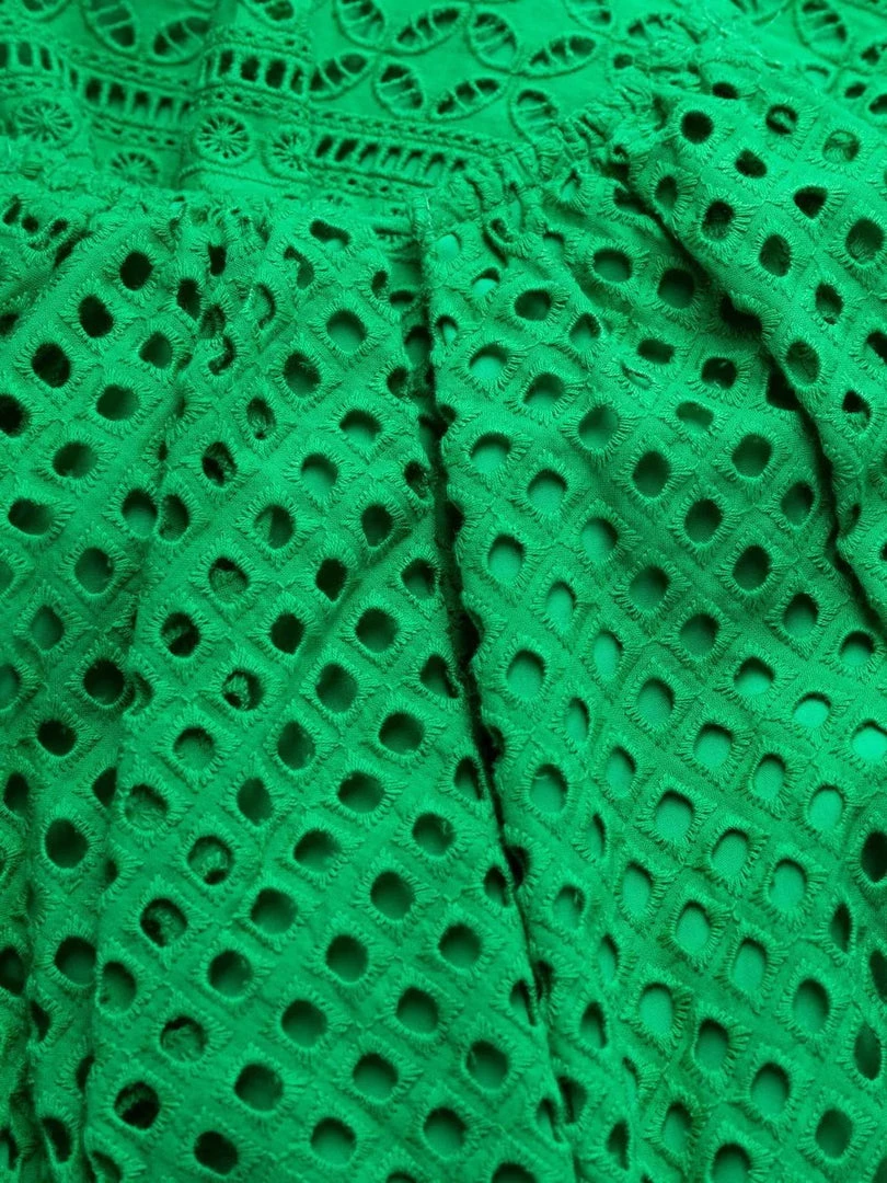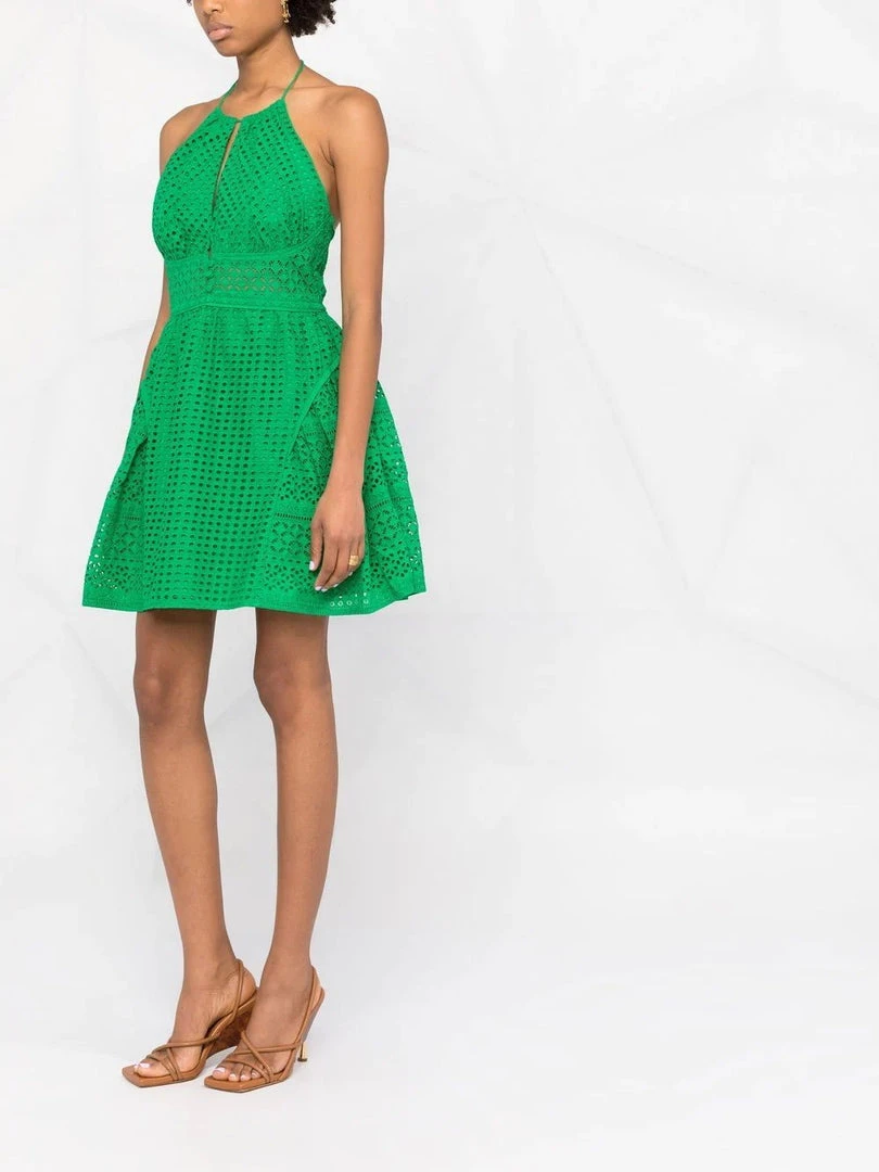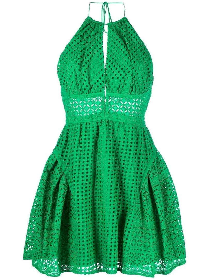 Self-Portrait green ‘Cotton Broderie Anglaise Mini Dress’ featuring a tie neck and back zip fastening, a front keyhole design, an open back, front button and loop detailing, side slip pockets and a flared skirt. Item fits true to size. Model is wearing a size 8 UK.