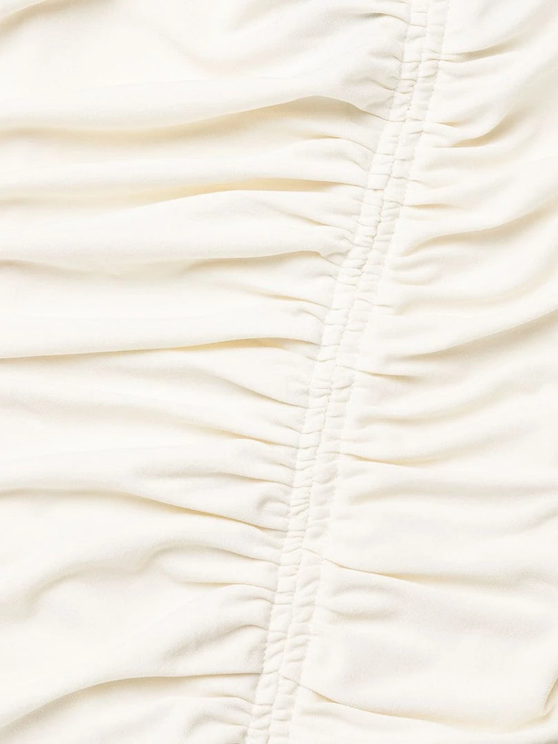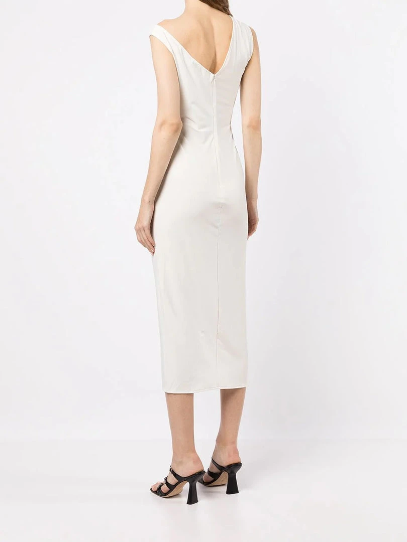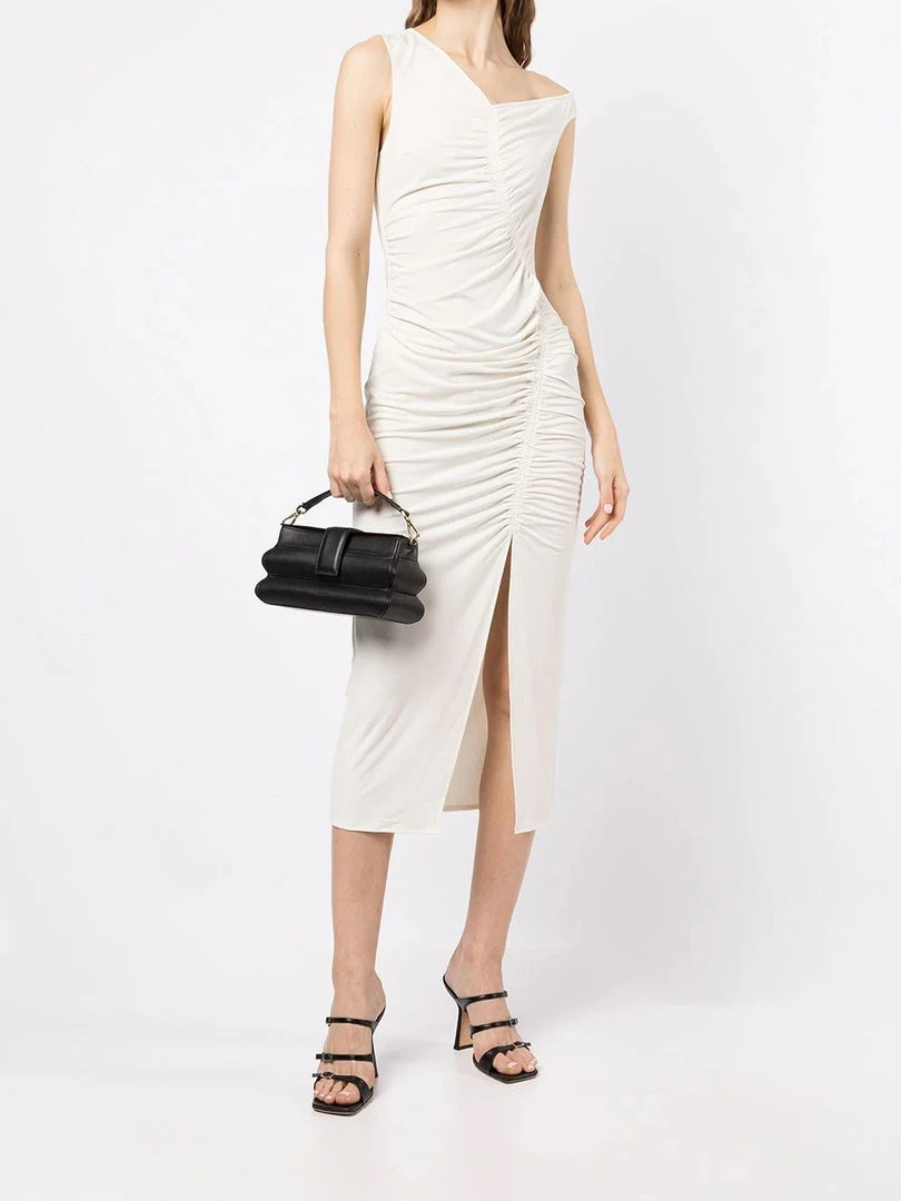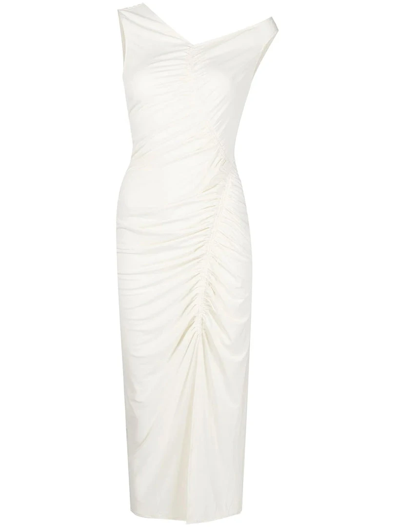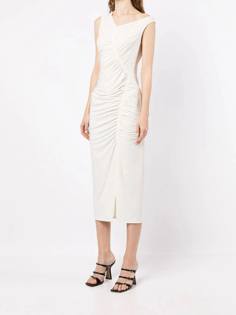 Self-Portrait ivory ‘Jersey Gathered Asymmetric Midi Dress’ featuring an asymmetric v-shaped shoulder line on the front and back, ruched detailing, a back zip and hook fastening, a front slit and a fitted silhouette. Item fits true to size. Model is wearing a size 8 UK.
