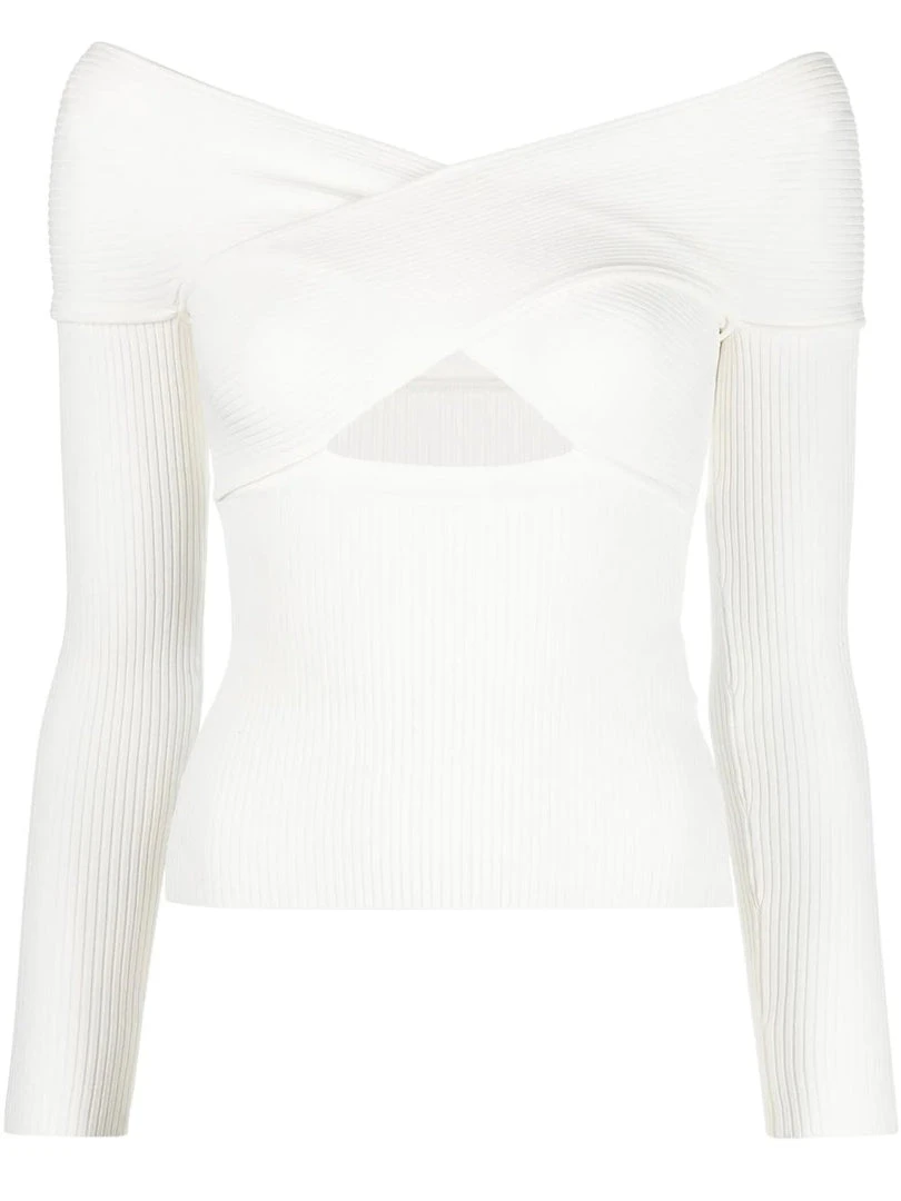 Self-Portrait white ‘Ribbed Knit Crossover Top’ featuring an off the shoulder design, long sleeves, front cut out detailing, a fitted style and pulls on. Item fits true to size. Model is wearing a size S.