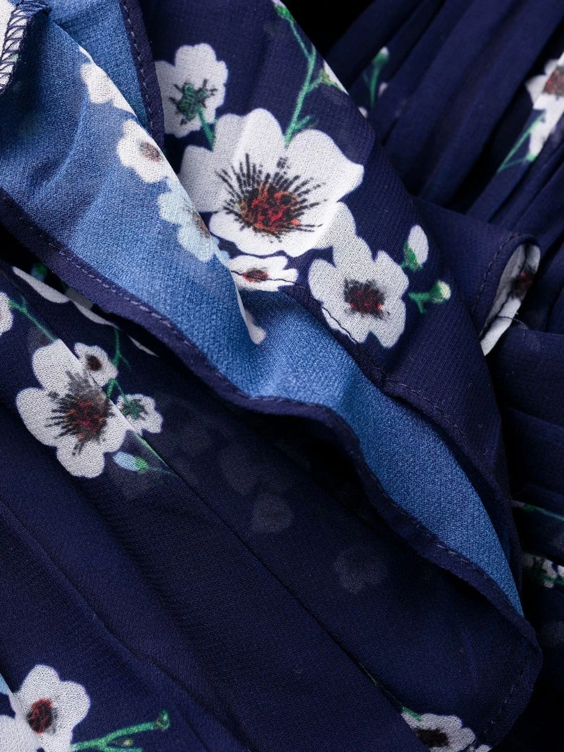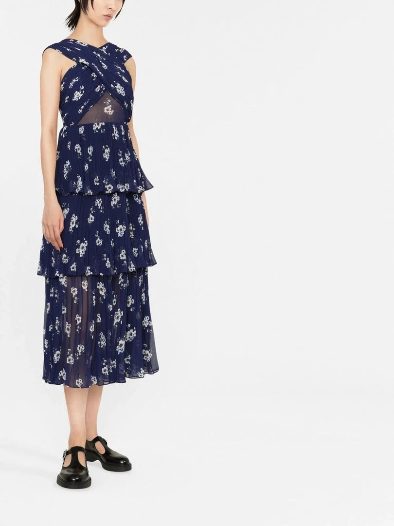 Self-Portrait blue ‘Pansy Print Chiffon Crossover Midi Dress’ featuring a back zip fastening, a sleeveless style, a pleated and tiered design and a floral print. Item fits true to size. Model is wearing a size 8 UK.
