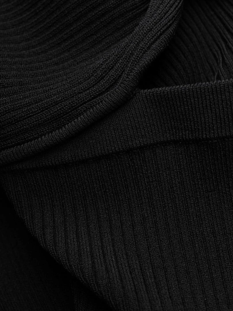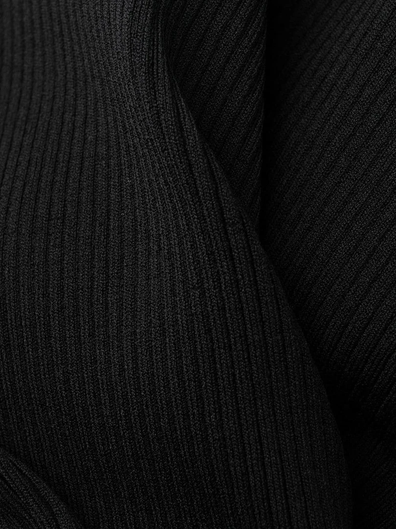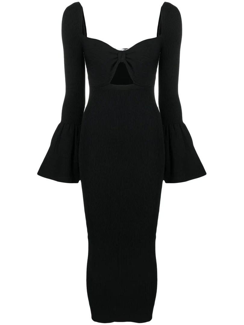 Self-Portrait black ‘Ribbed Knit Bow Bust Midi Dress’ featuring a front cut out design, long sleeves with flared cuffs, a pull on style and a fitted silhouette. Item fits true to size. Model is wearing a size S.