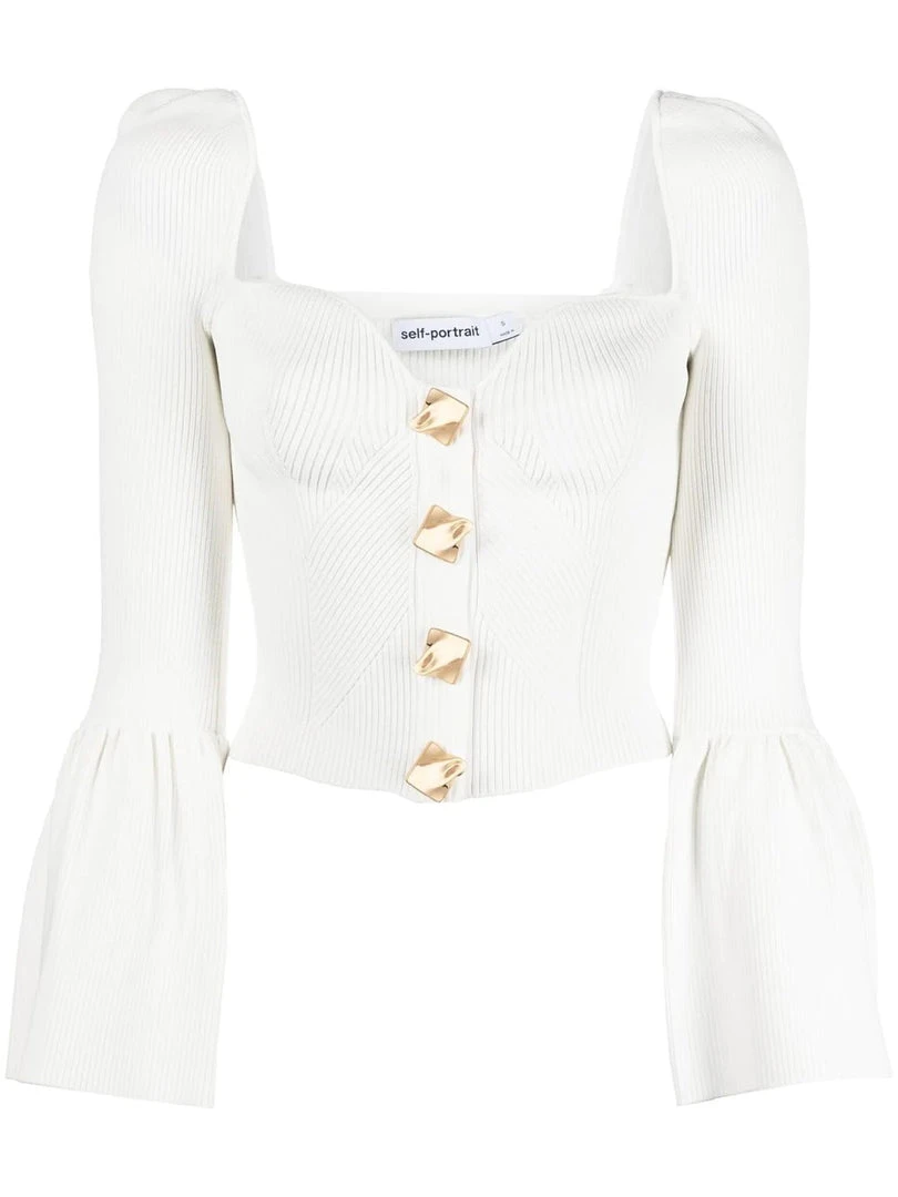 Self-Portrait white ‘Ribbed Knit Cardigan’ featuring a sweetheart neckline, front button gold fastenings, long sleeves with flared cuffs and a fitted style. Item fits true to size. Model is wearing a size S.