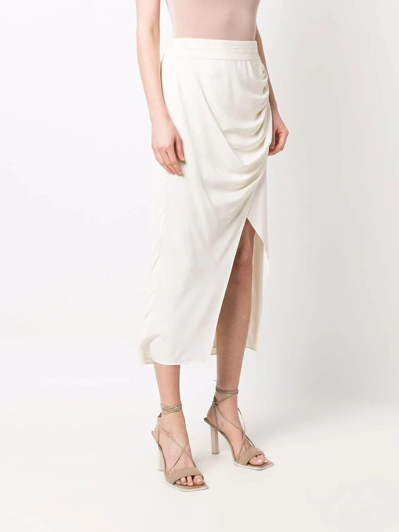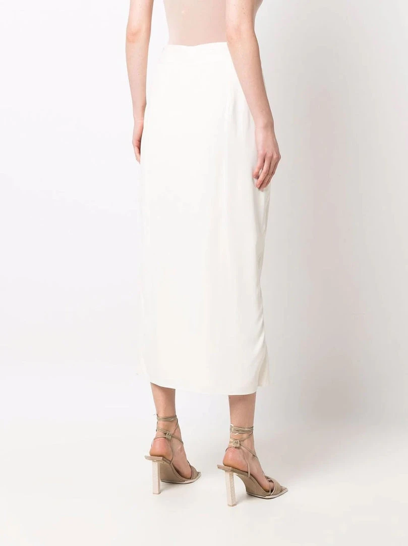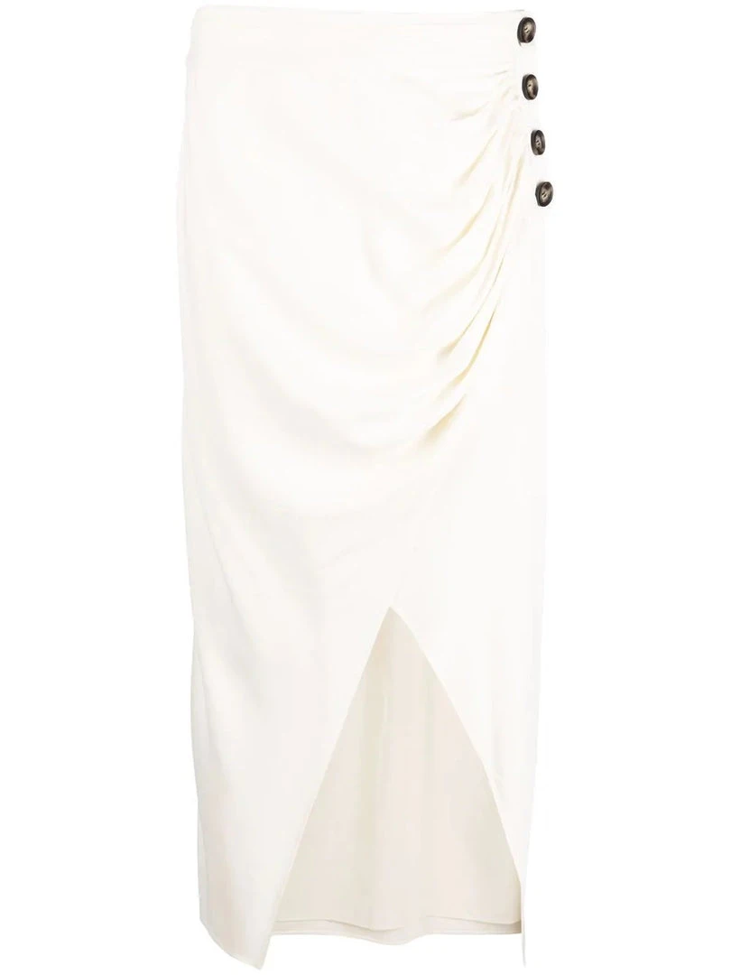 Self-Portrait ivory ‘Wrap Button Midi Skirt’ featuring a wrap style with side button fastenings, pleated details, a front slit and a midi length. Item fits true to size. Model is wearing a size 8 UK.