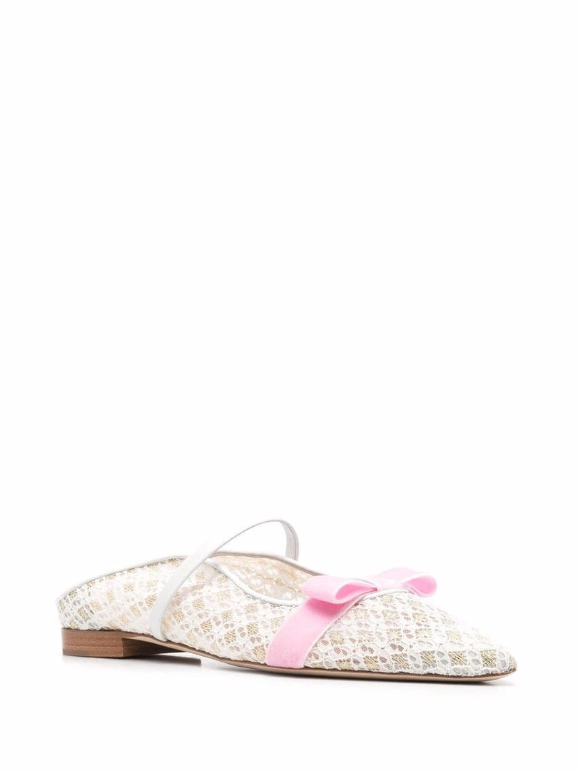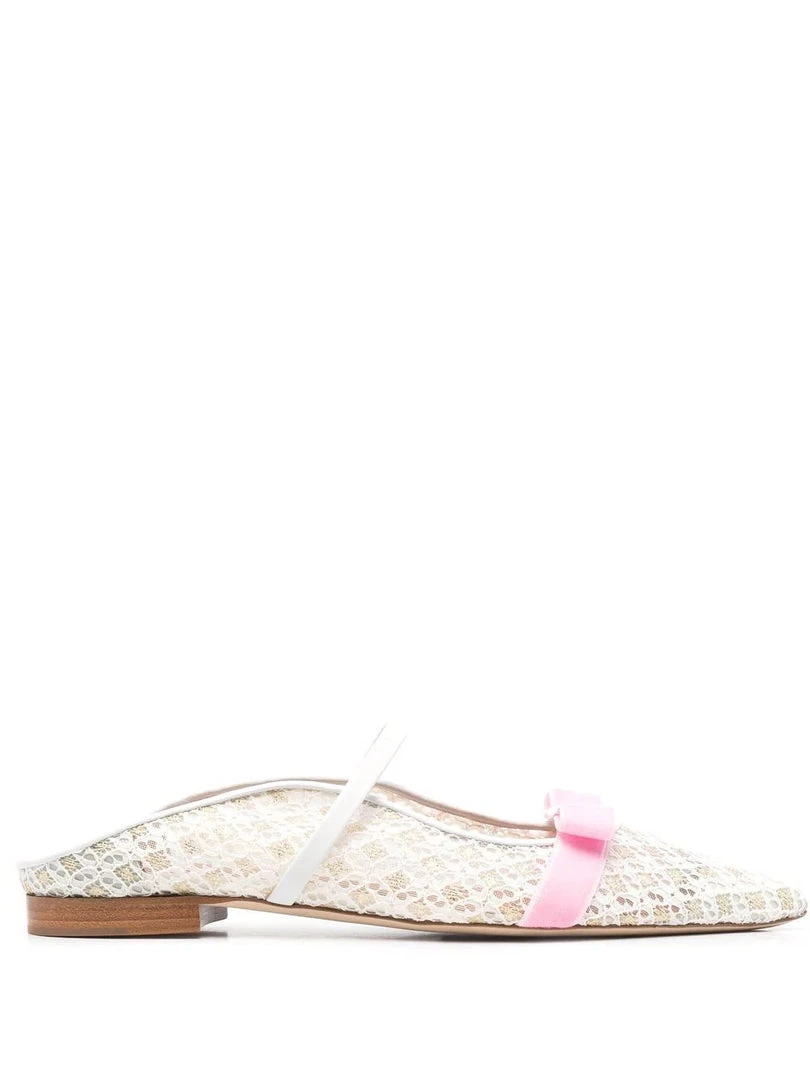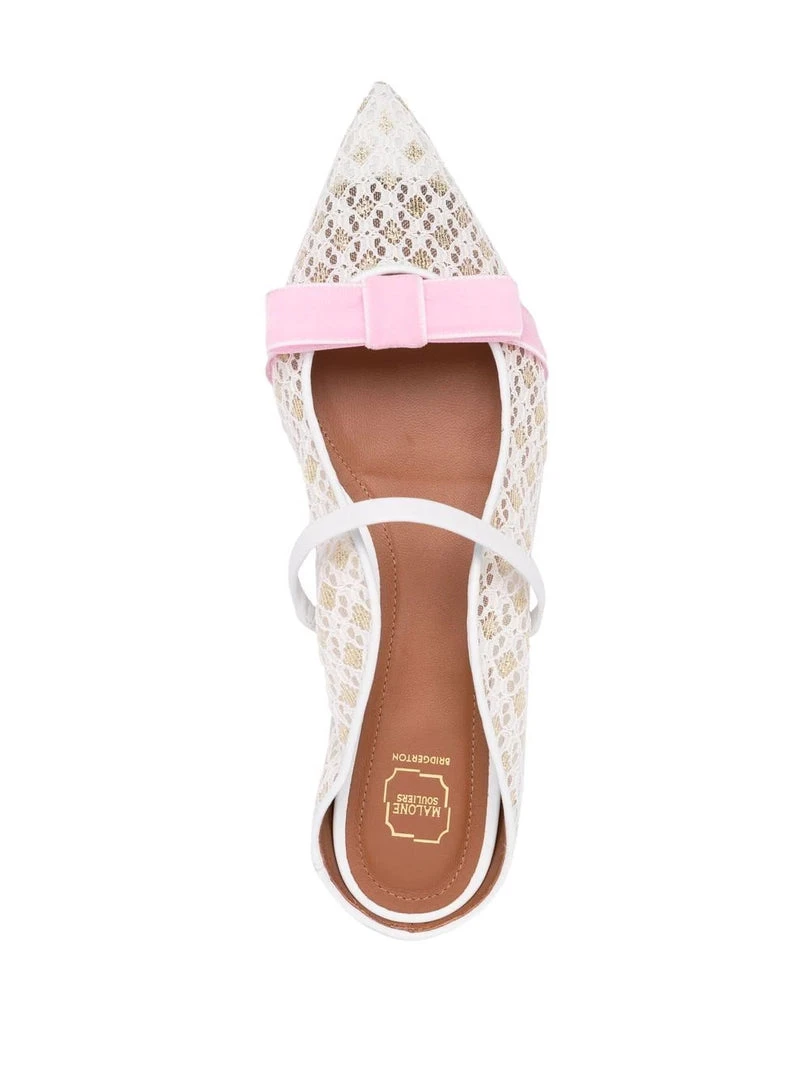 Malone Souliers x Bridgerton ‘Marguerite’ flat pumps featuring a pointed toe, a white and gold laced design, a pink bow detail, a single leather strap, a branded insole and a slip on style. Made in Italy. Item fits true to size. Italian Sizing.