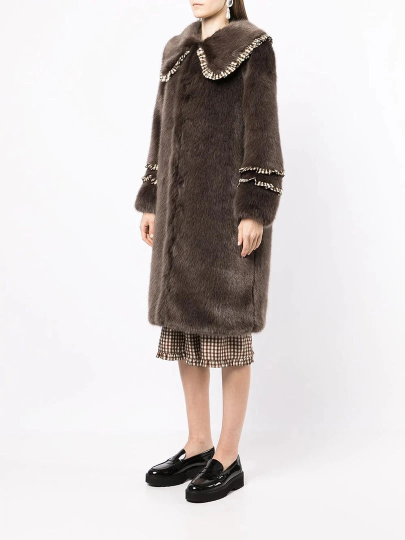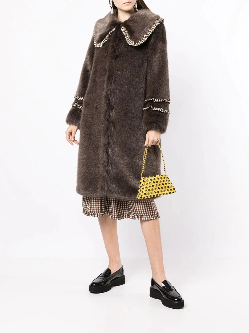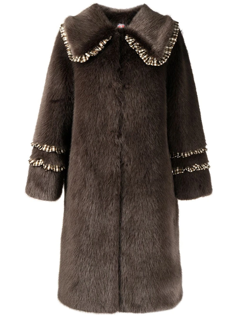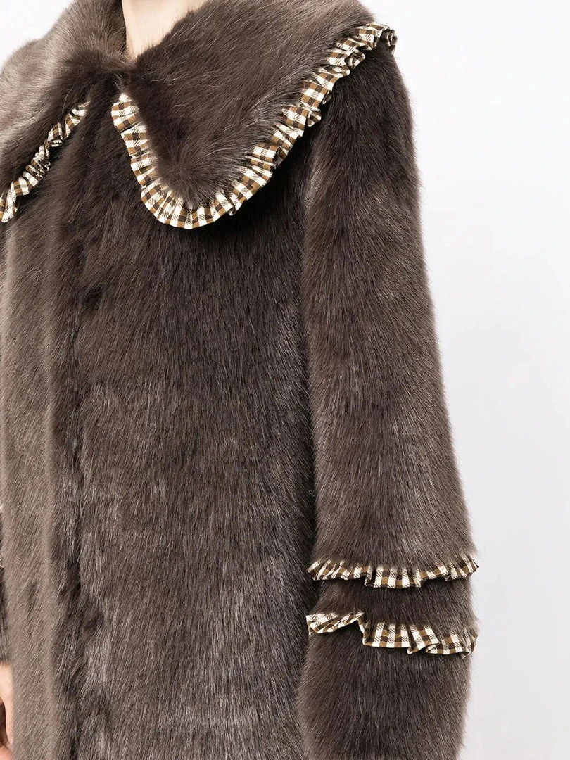 Shrimps ‘Brandy’ long faux fur coat featuring a round collar with brown check ruffled trimming, front hook and eye fastenings, long sleeves with brown check ruffled cuff details, side slip pockets, a brown faux fur style and a midi length. Item fits true to size. Model is wearing a size 8 UK.Â