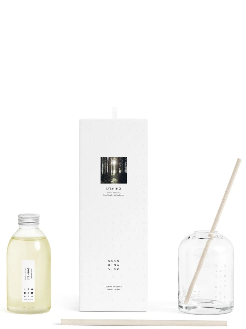 Skandinavisk’s diffusers bring subtle and stable fragrance to your home for weeks on end. Echoing the role of the flower vase in the home, of bringing nature indoors, and of reusability. Mouth-blown, decorated glass vase with a blend of perfume and natural alcohol for improved fragrance diffusion. Fragrance is contained inside a sealed refill bottle. Box includes 3 thick reed sticks. Liquid blend of perfume, Augeo and natural alcohol. Will scent a room for 4+ months. LYSNING, Danish for ‘forest glade’. Mosses & lichens, pine needles & cloudberry. The dense boreal forest canopy occasionally reveals glades and clearings, hidden escapes where the sunlight touches the ground and the flora responds in abundance.