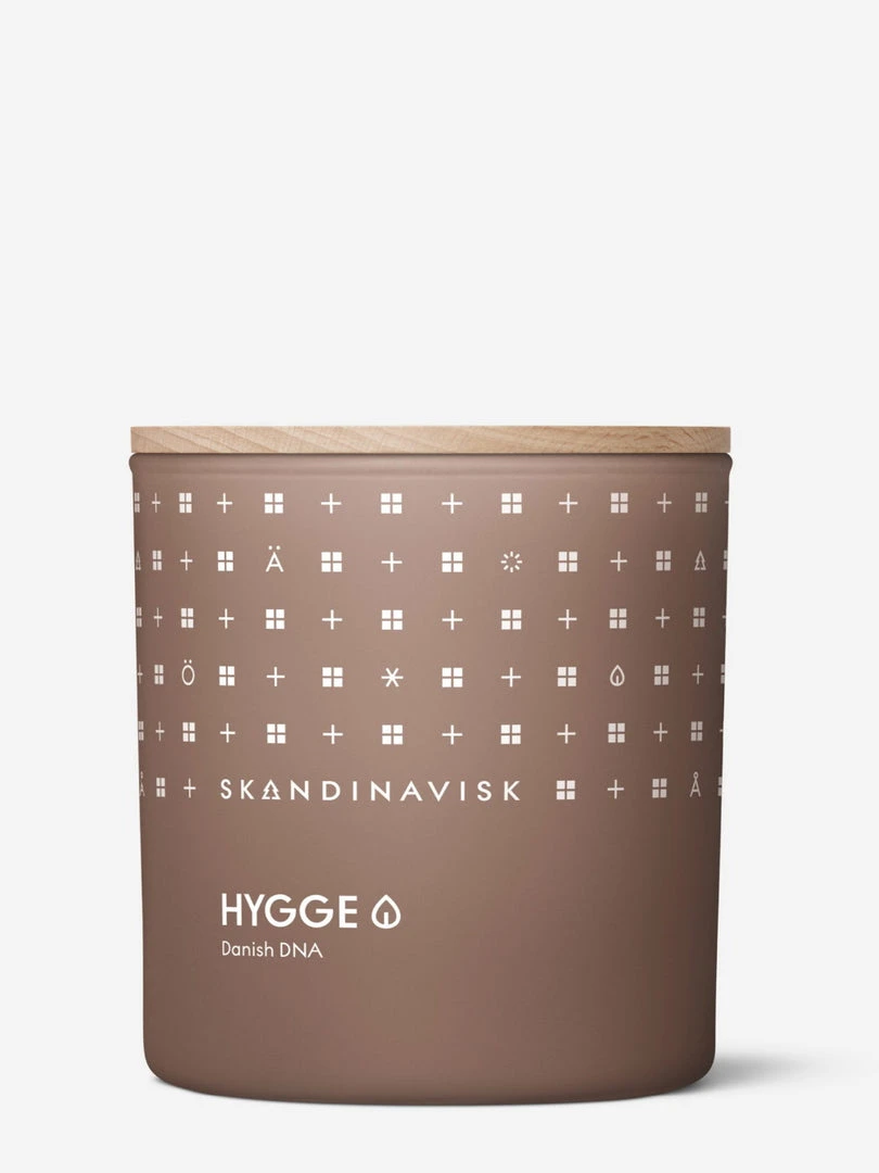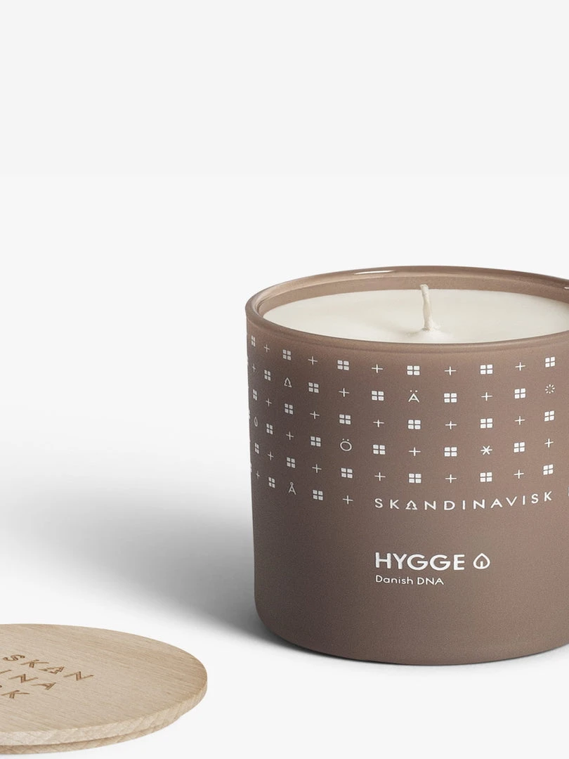 Skandinavisk ‘HYGGE’ scented candle featuring a perfume and Swedish rapeseed wax blend in painted glass with a pure cotton wick and engraved beechwood lid. 200ML.