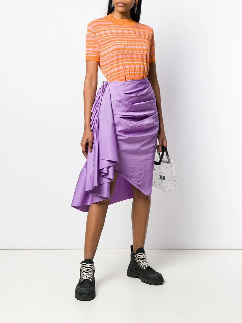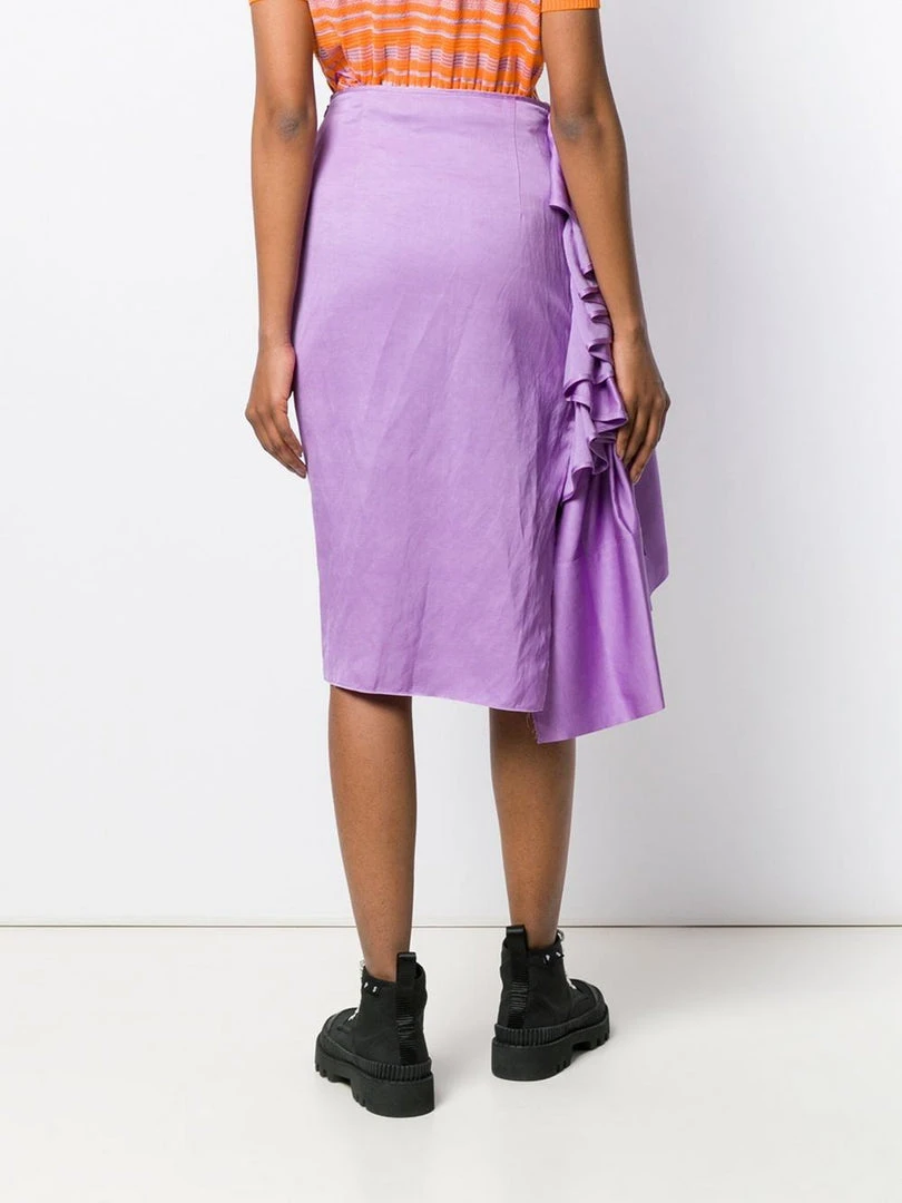 Solace London ‘Belot’ skirt featuring a side zip fastening, ruffle detail with a side tie up bow detail and an asymmetric hemline. Item fits true to size. Model is wearing a size 8 UK.