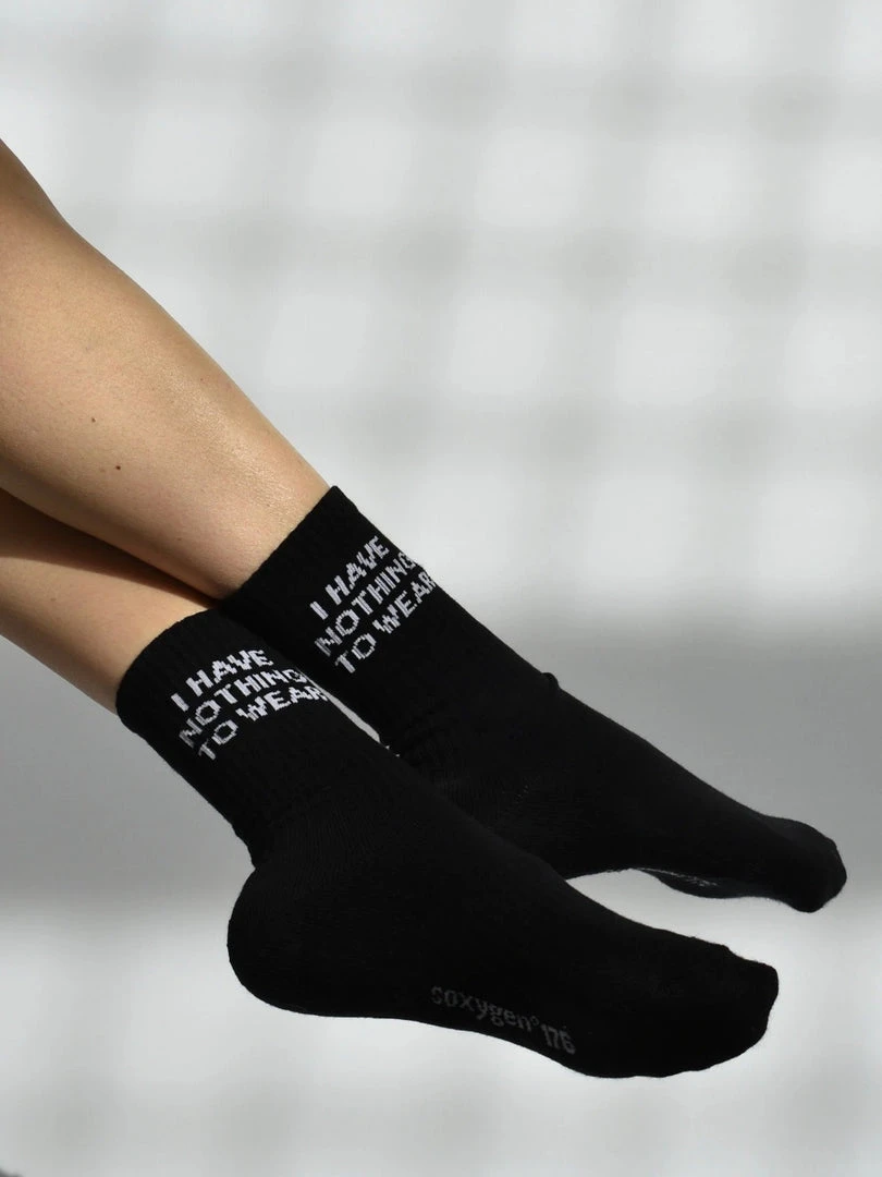 Soxygen black ‘I Have Nothing To Wear’ classic socks featuring a cushioned heel and toe, arch support, a brand logo on the sole, a white ‘I Have Nothing To Wear’ slogan on the sides and a ribbed design. Unisex style. Item is One Size.