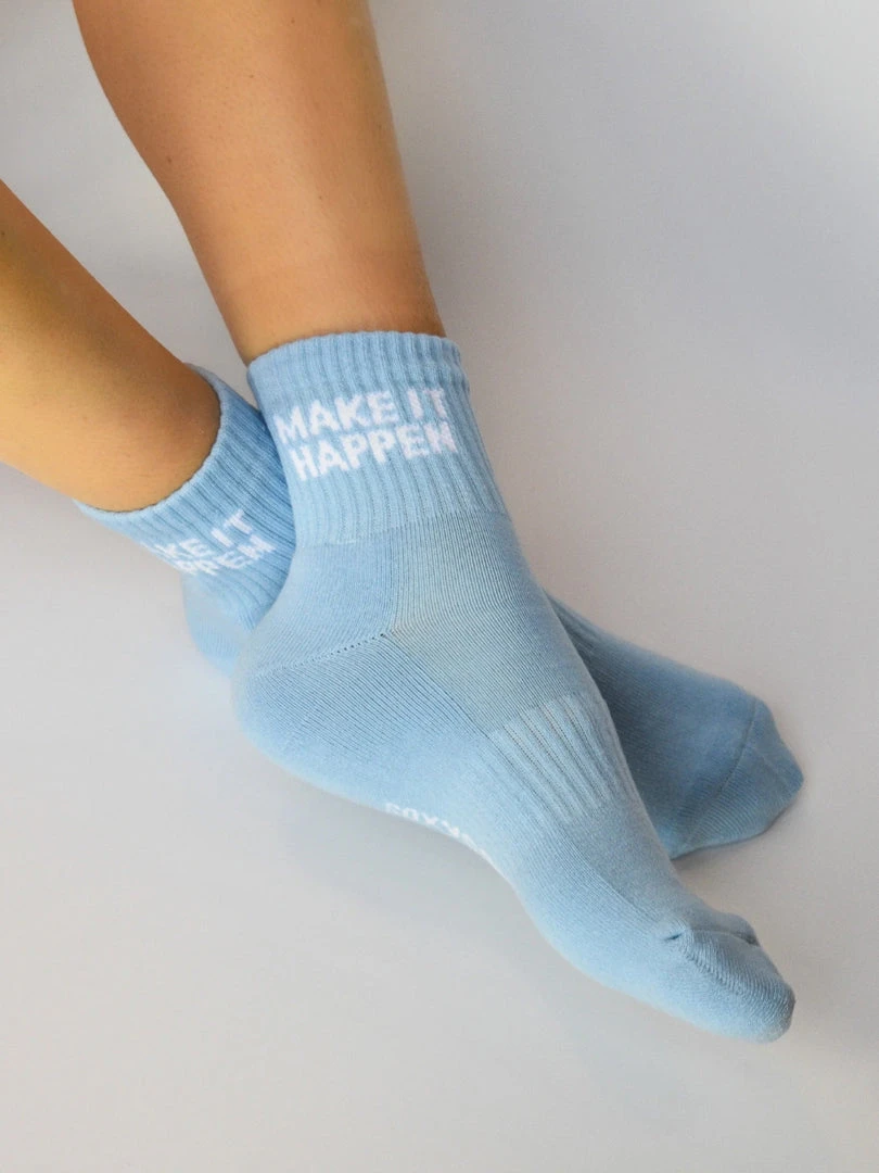 Soxygen sky blue ‘Make It Happen’ ankle socks featuring a cushioned heel and toe, arch support, a brand logo on the sole, a white ‘Make It Happen’ slogan on the sides and a ribbed design. Unisex style. Item is One Size.