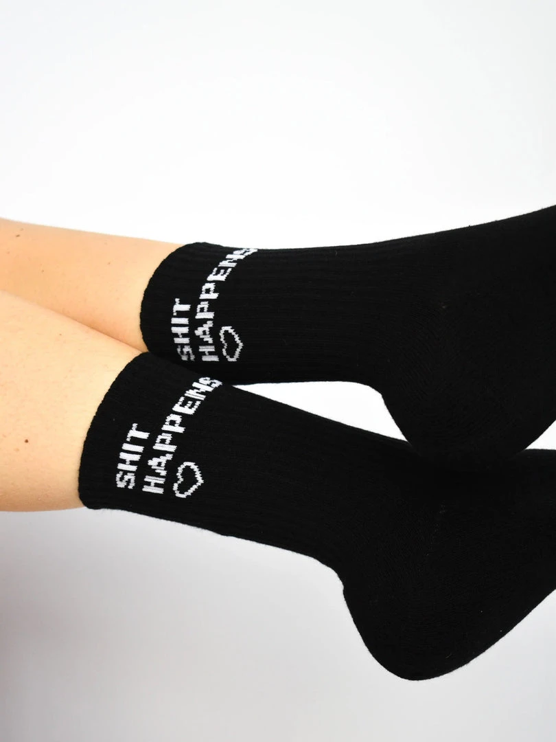 Soxygen black ‘Shit Happens’ classic socks featuring a cushioned heel and toe, arch support, a brand logo on the sole, a white ‘You Got This’ slogan and love heart on the sides and a ribbed design. Unisex style. Item is One Size.