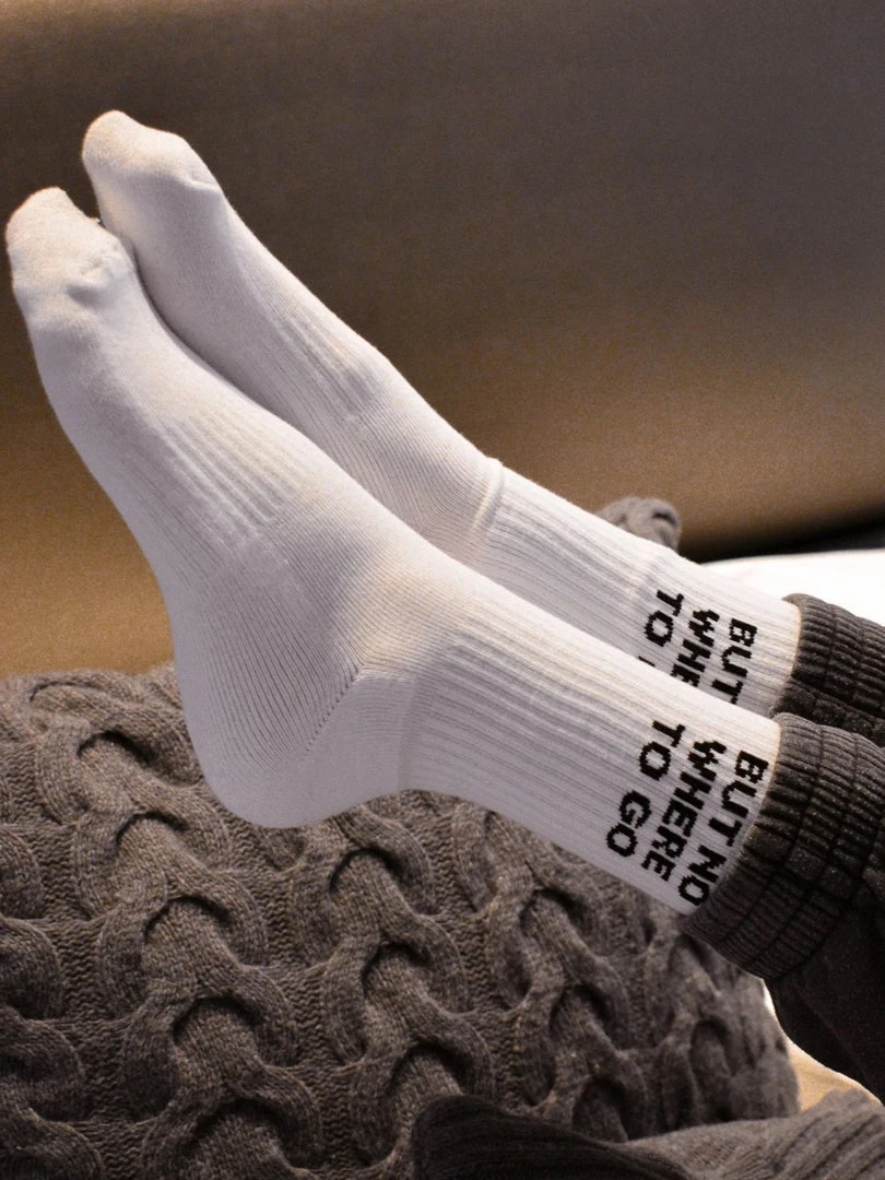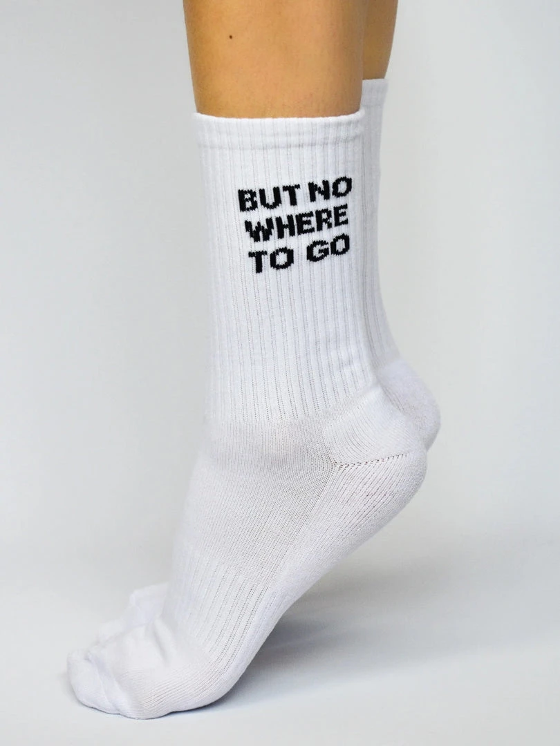 Soxygen white ‘But Nowhere To Go’ classic socks featuring a cushioned heel and toe, arch support, a brand logo on the sole, a black ‘But No Where To Go’ slogan on the sides and a ribbed design. Unisex style. Item is One Size.