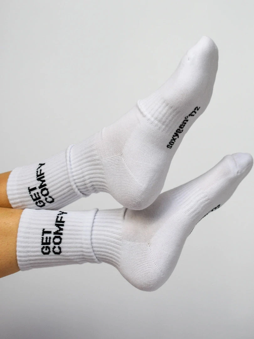 Soxygen white ‘Get Comfy’ classic socks featuring a cushioned heel and toe, arch support, a brand logo on the sole, a black ‘Get Comfy’ slogan on the sides and a ribbed design. Unisex style. Item is One Size.