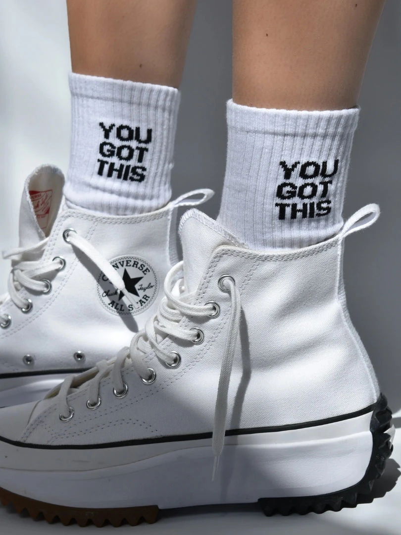 Soxygen white ‘You Got This’ classic socks featuring a cushioned heel and toe, arch support, a brand logo on the sole, a black ‘You Got This’ slogan on the sides and a ribbed design. Unisex style. Item is One Size.