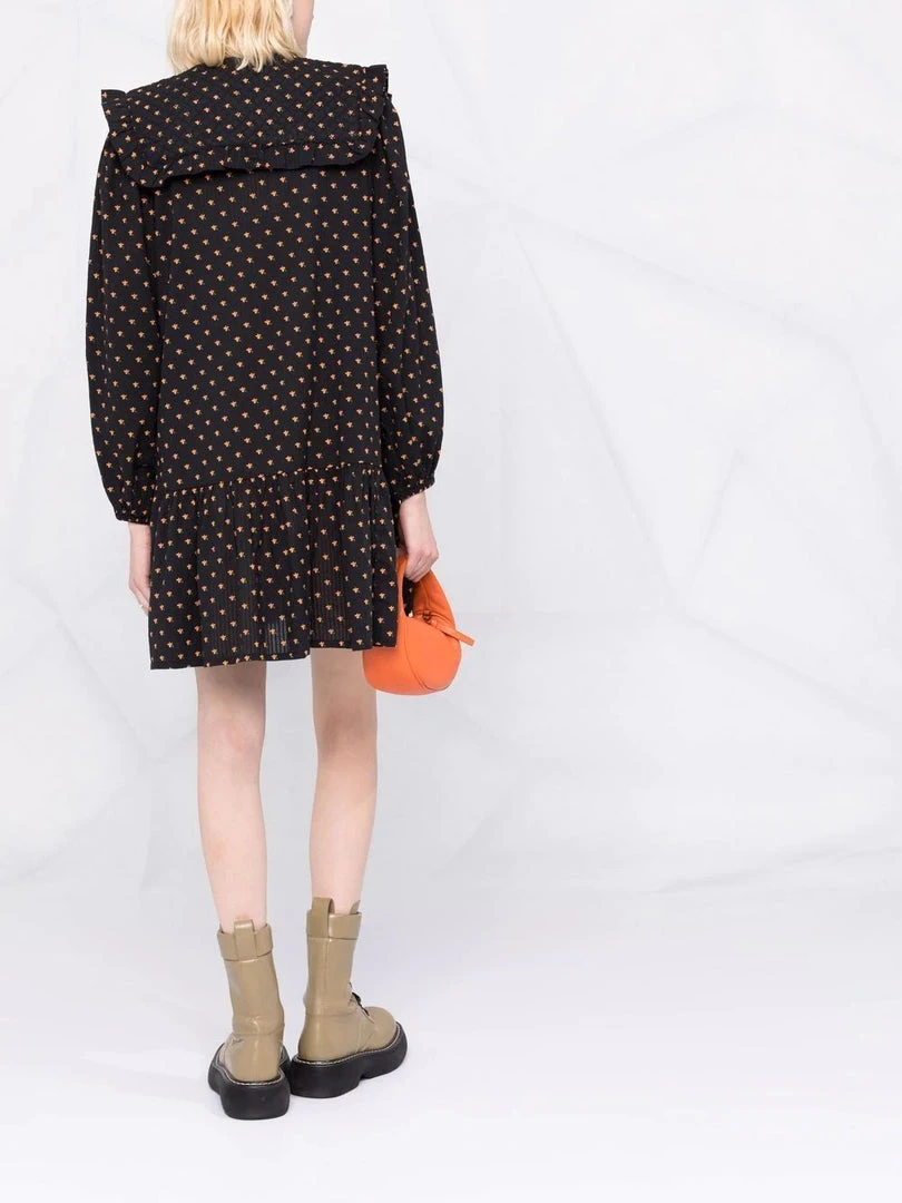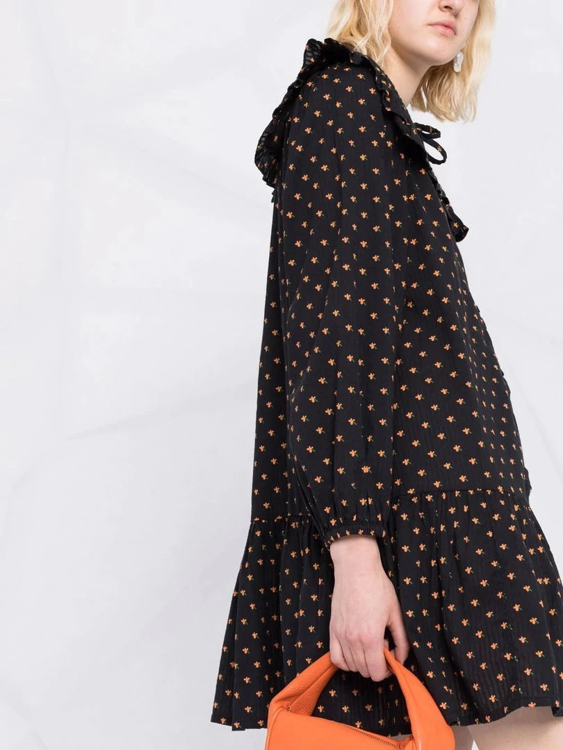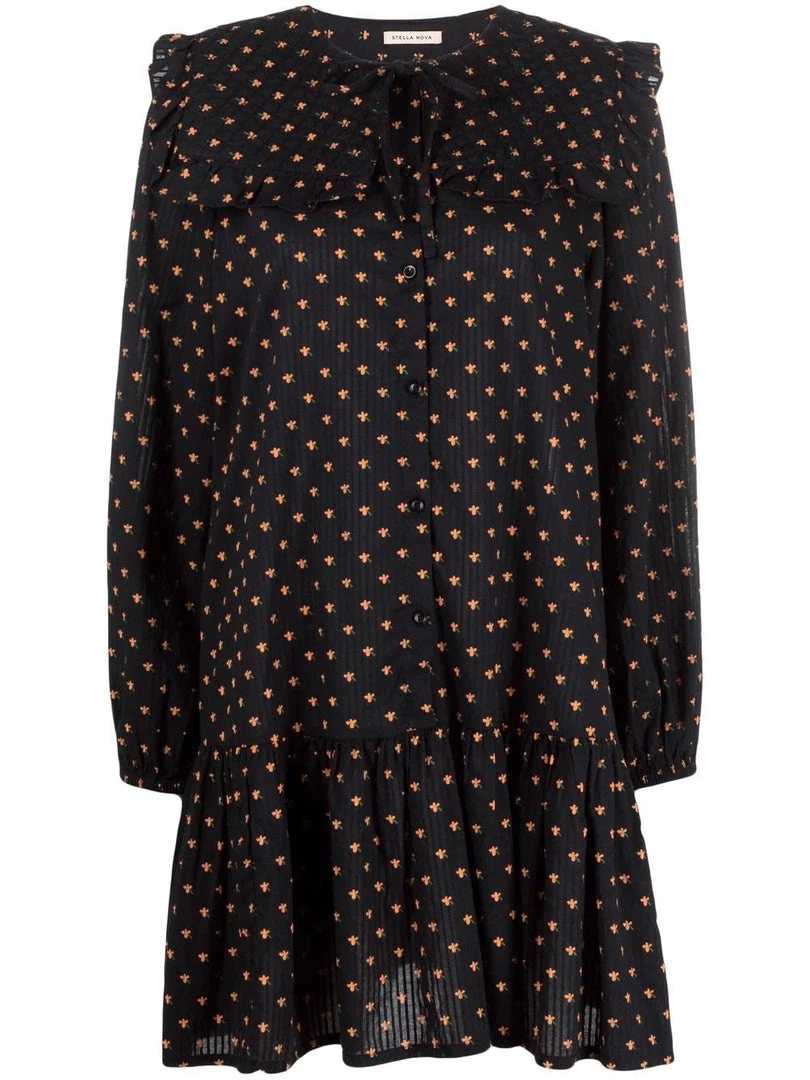 Stella Nova black ‘Charlie’ ditsy floral mini dress featuring an oversized square collar with ruffled trimming, front tie and button fastenings, long sleeves with elasticated cuffs, a ruffled skirt hemline, an orange ditsy floral print, a relaxed fit and a short length. Item fits true to size. Model is wearing a size 36 DE/DK.Â