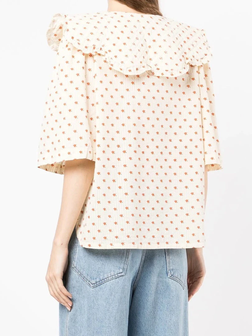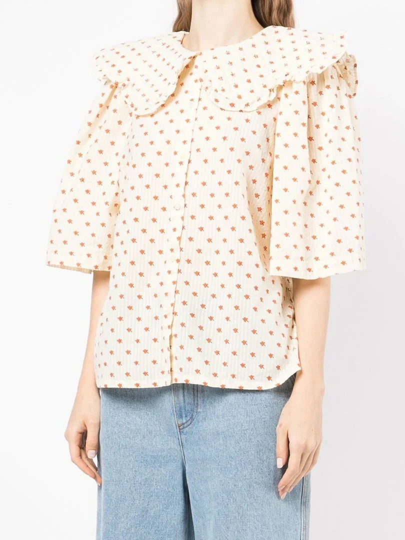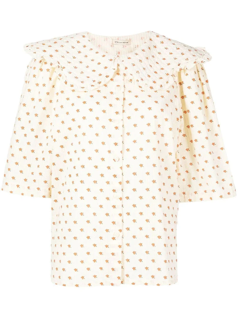 Stella Nova cream ‘Dicte’ ditsy floral shirt featuring an oversized scalloped collar with ruffled trimming, front button fastenings, short bell sleeves, side slits, a curved hemline, an orange ditsy floral print and a relaxed fit. Item fits true to size. Model is wearing a size 36 DE/DK.Â