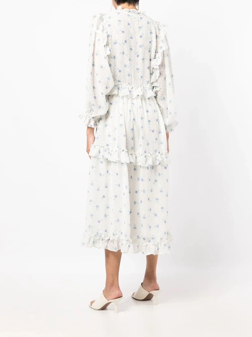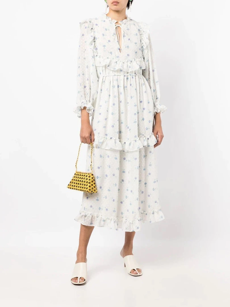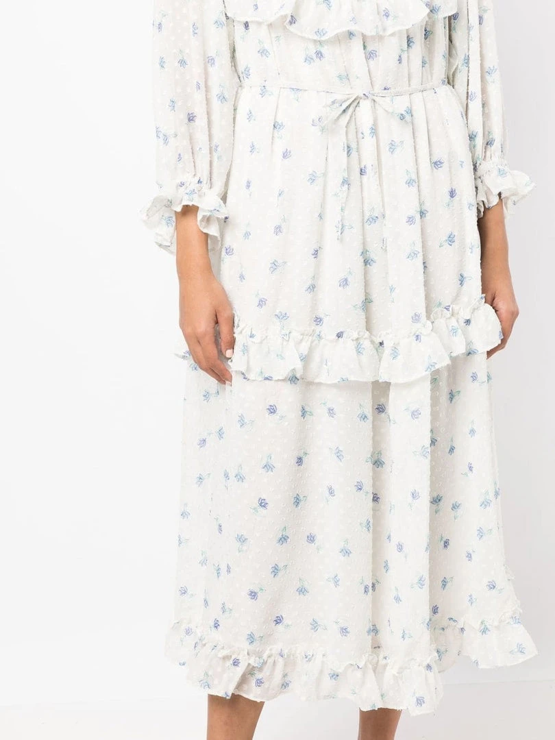 Stella Nova light blue ‘Barbara’ tiered midi dress featuring a v-neckline with a tie detail, ruffle and frilled trimming, a tie waist, long sleeves with elasticated cuffs, a blue floral print and a slightly sheer design. Item fits true to size. Model is wearing a size 34 DE/DK.Â