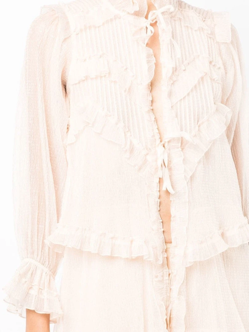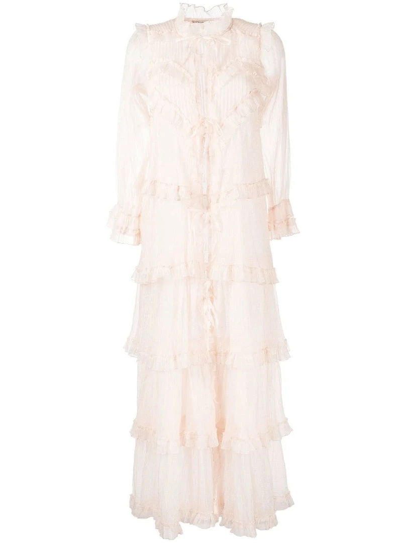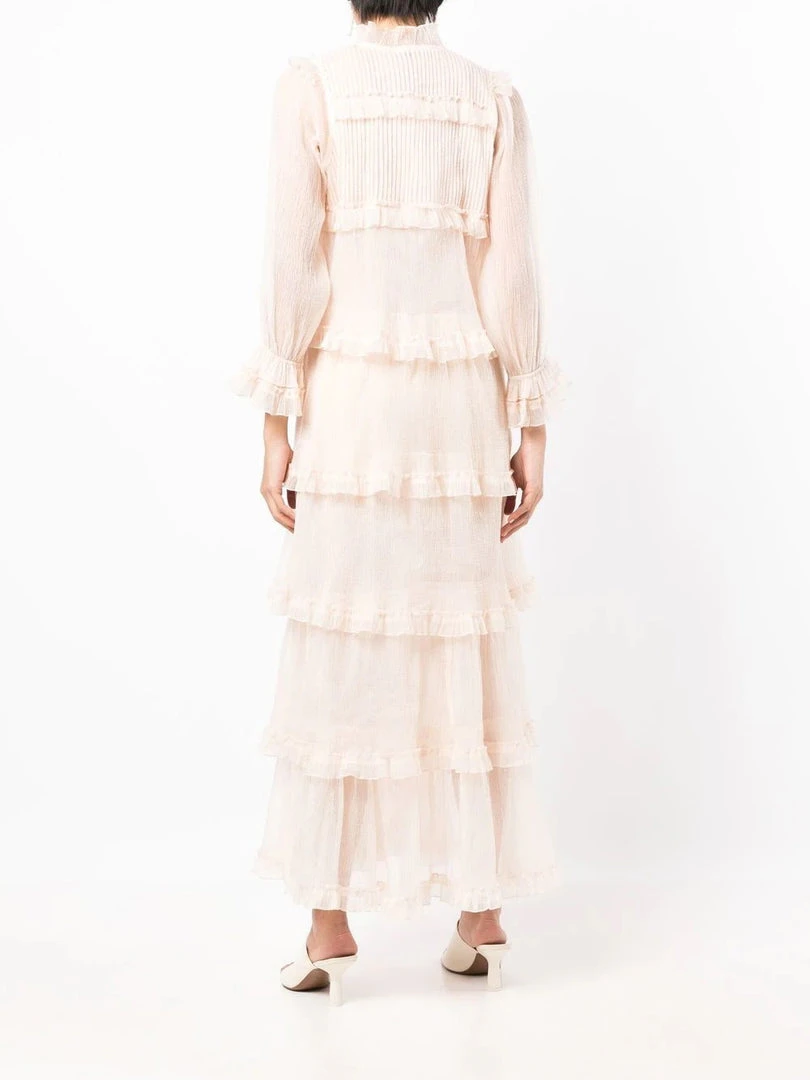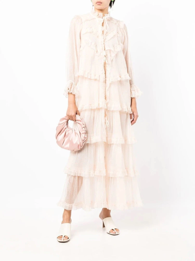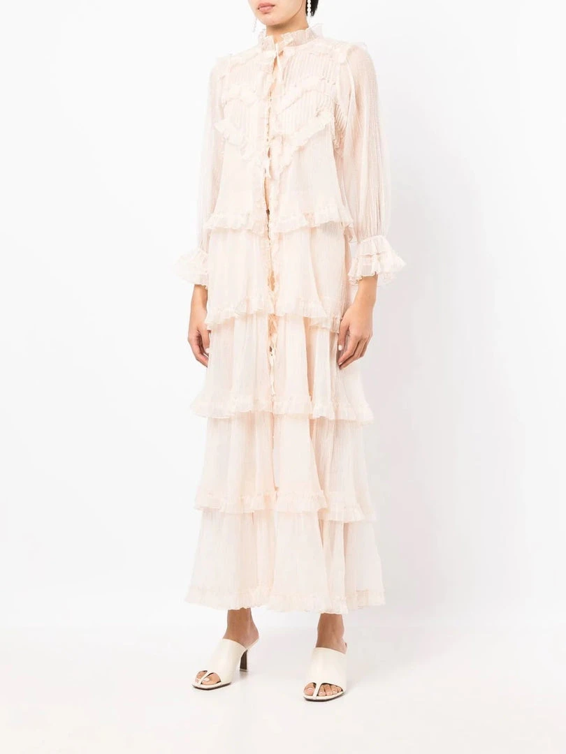 Stella Nova nude ‘Monroe’ tiered sheer long dress featuring a raised neck, ruffled trimming, front tie fastenings, long sleeves with flared cuffs, a pleated design and an oversized fit. Model is wearing a size 34 DE/DK.Â