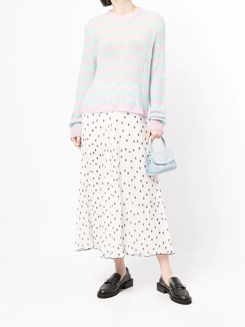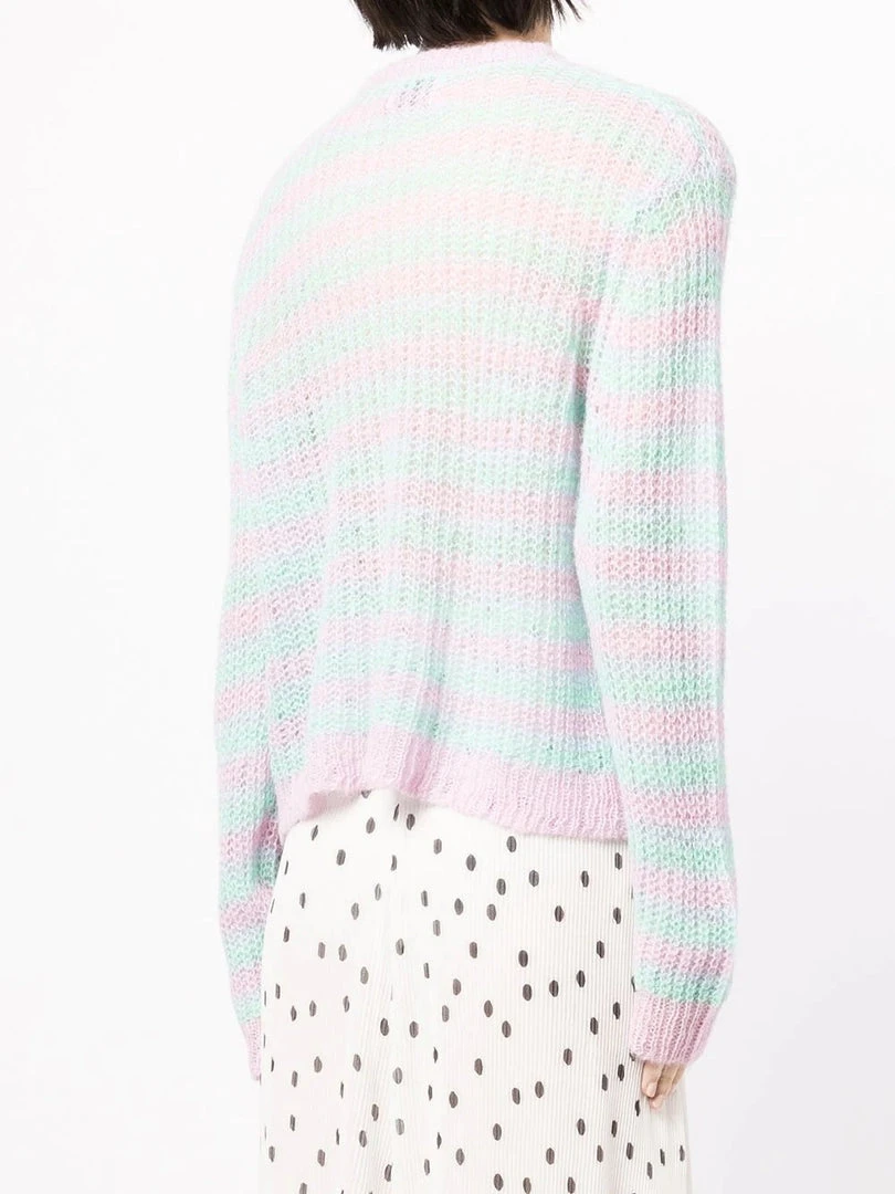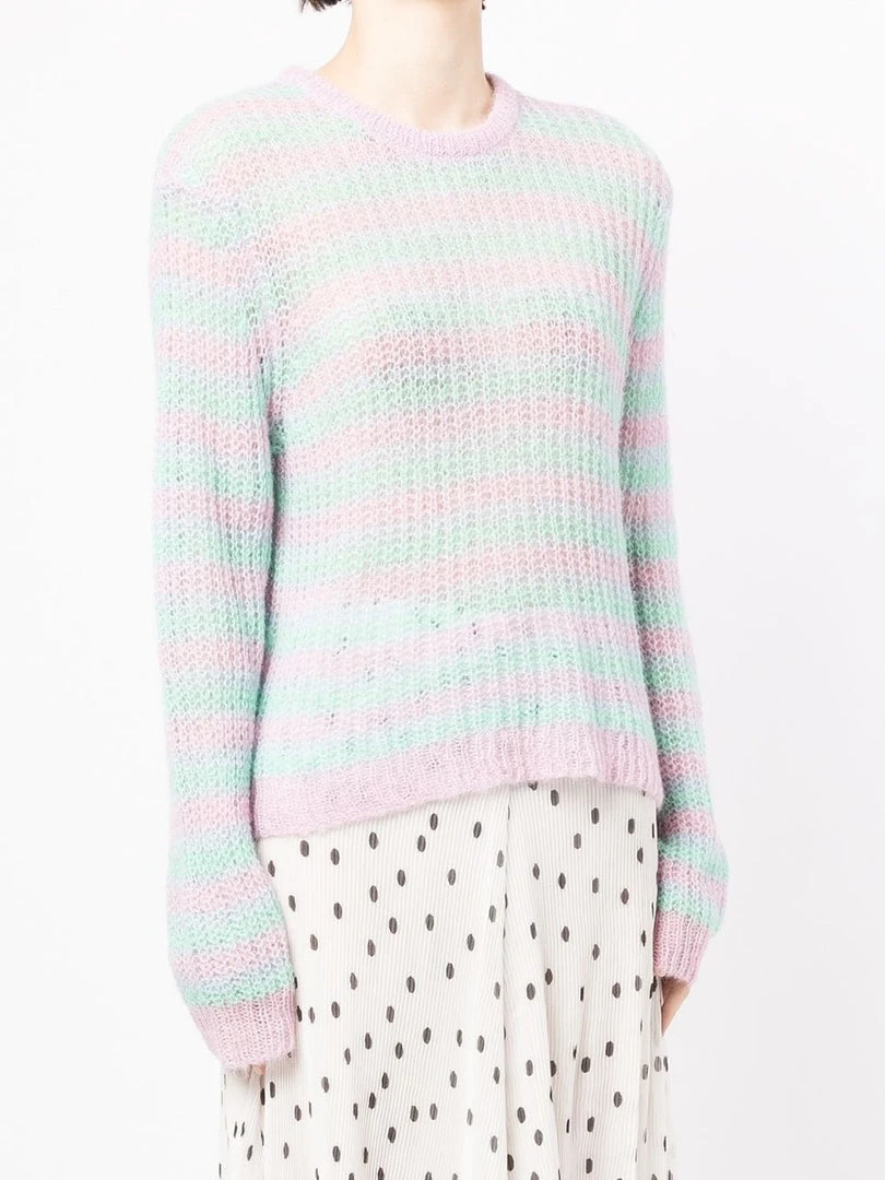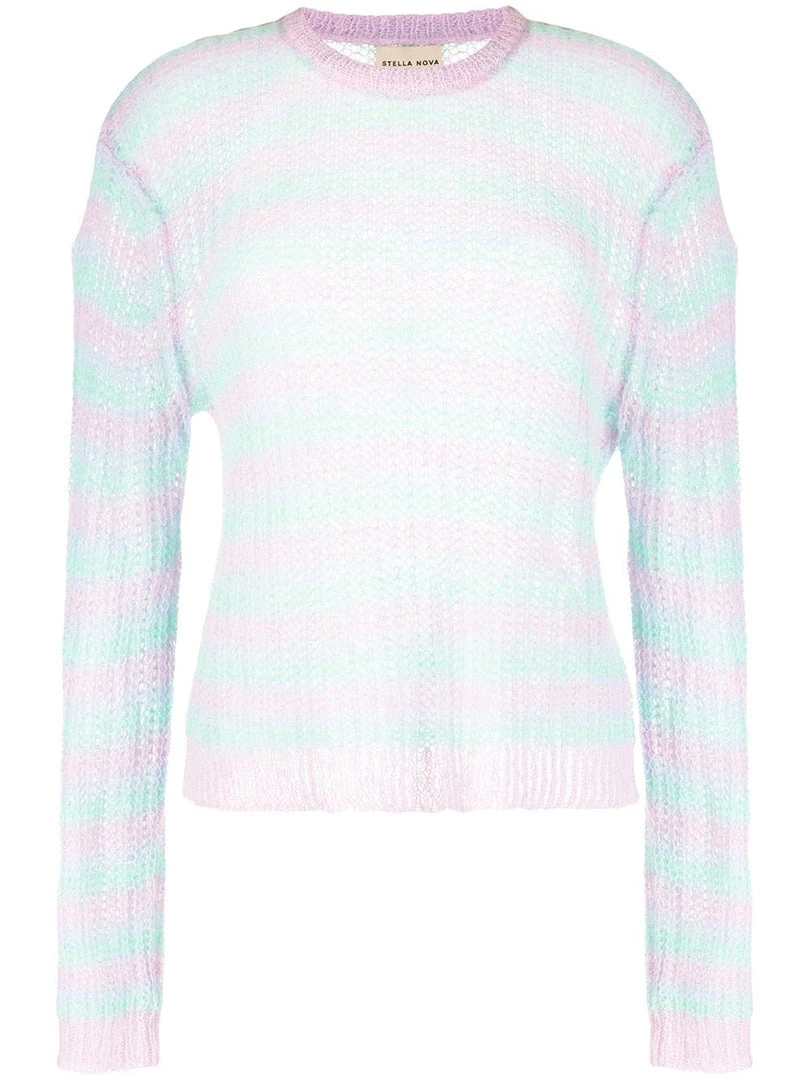 Stella Nova ‘Rima Joe’ pastel stripe sweater featuring a crew neckline, long sleeves, a blue, pink and green stripe knit and pulls on. Item fits true to size. Model is wearing a size S.Â