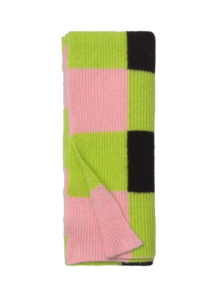Stine Goya ‘Orphea’ check scarf featuring a ribbed knit and a green, pink and black check print. Item is One Size. Made in China.Â