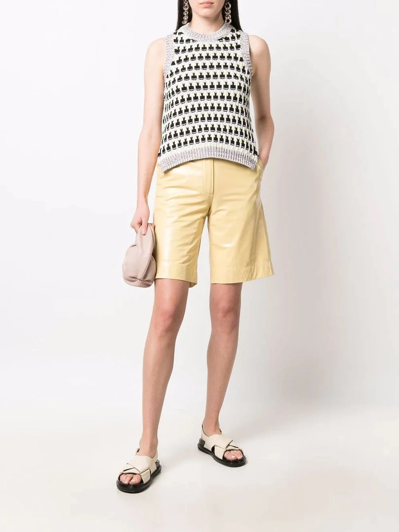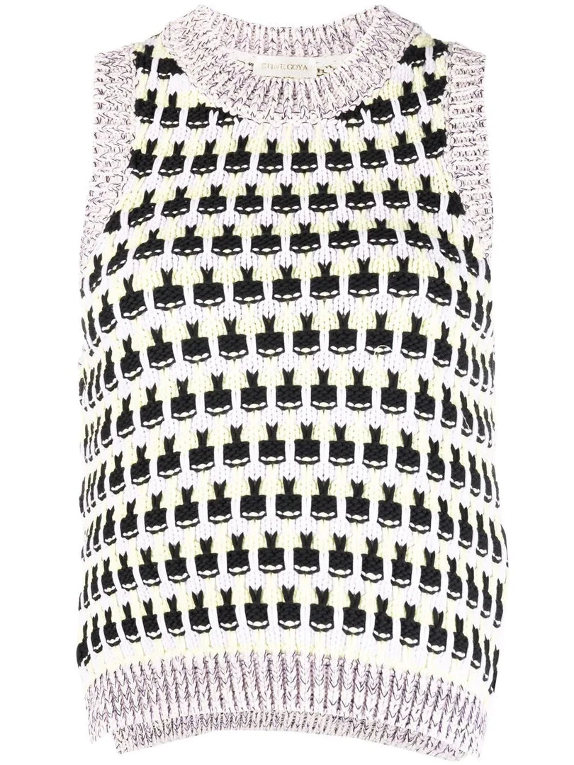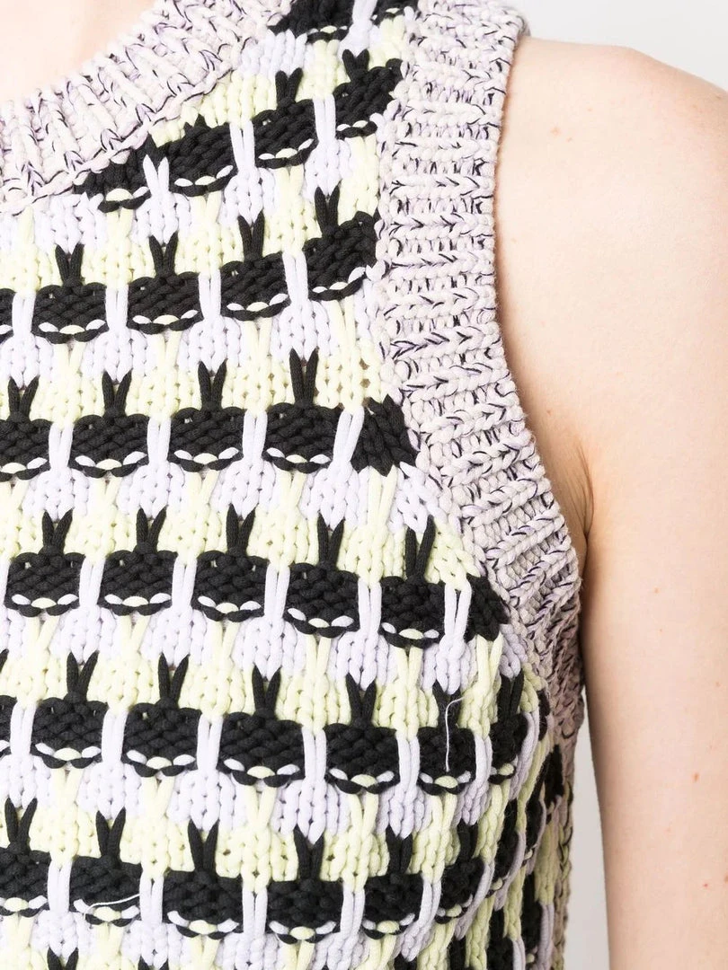 Stine Goya ‘Greta’ chunky knit vest featuring a crew neckline, a sleeveless design, a black, lilac and pastel green chunky knit, a contrasting back, side slits, a high-low hemline and pulls on. Item fits true to size. Model is wearing a size XS.Â