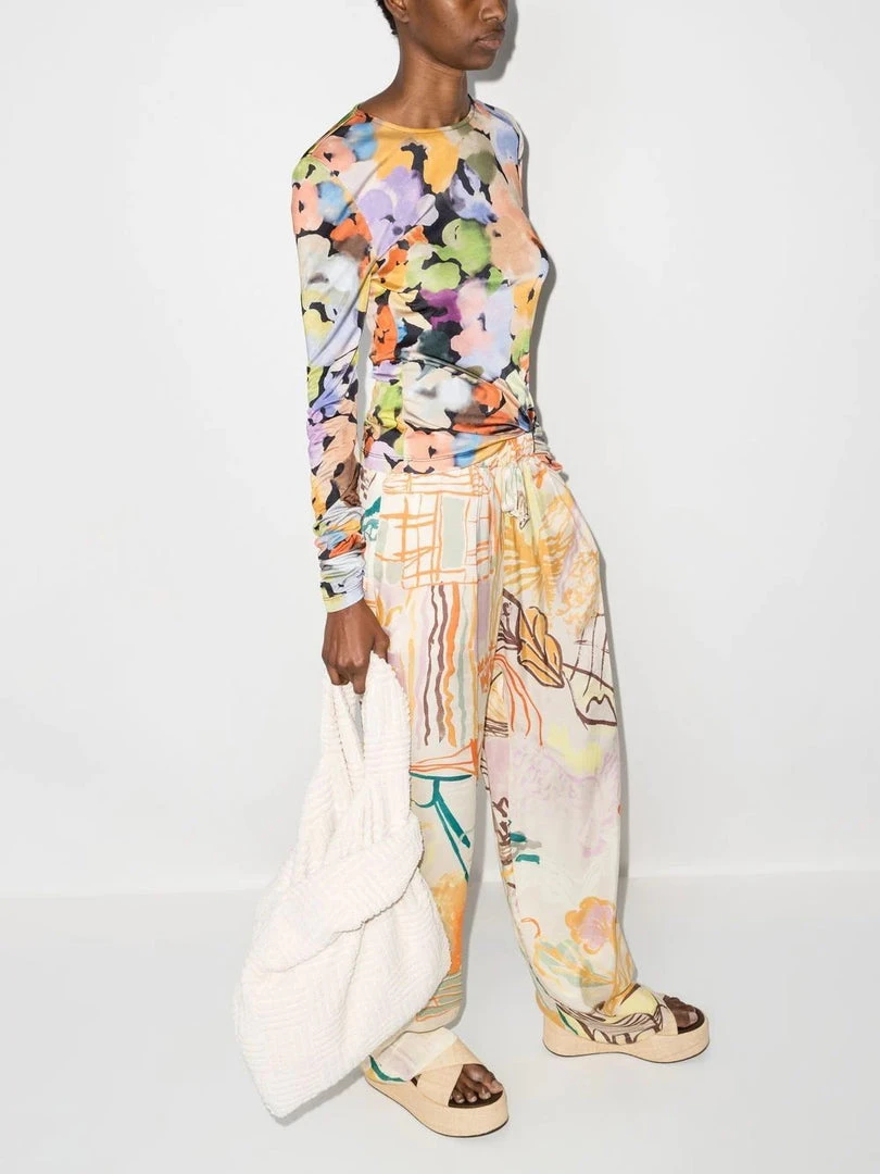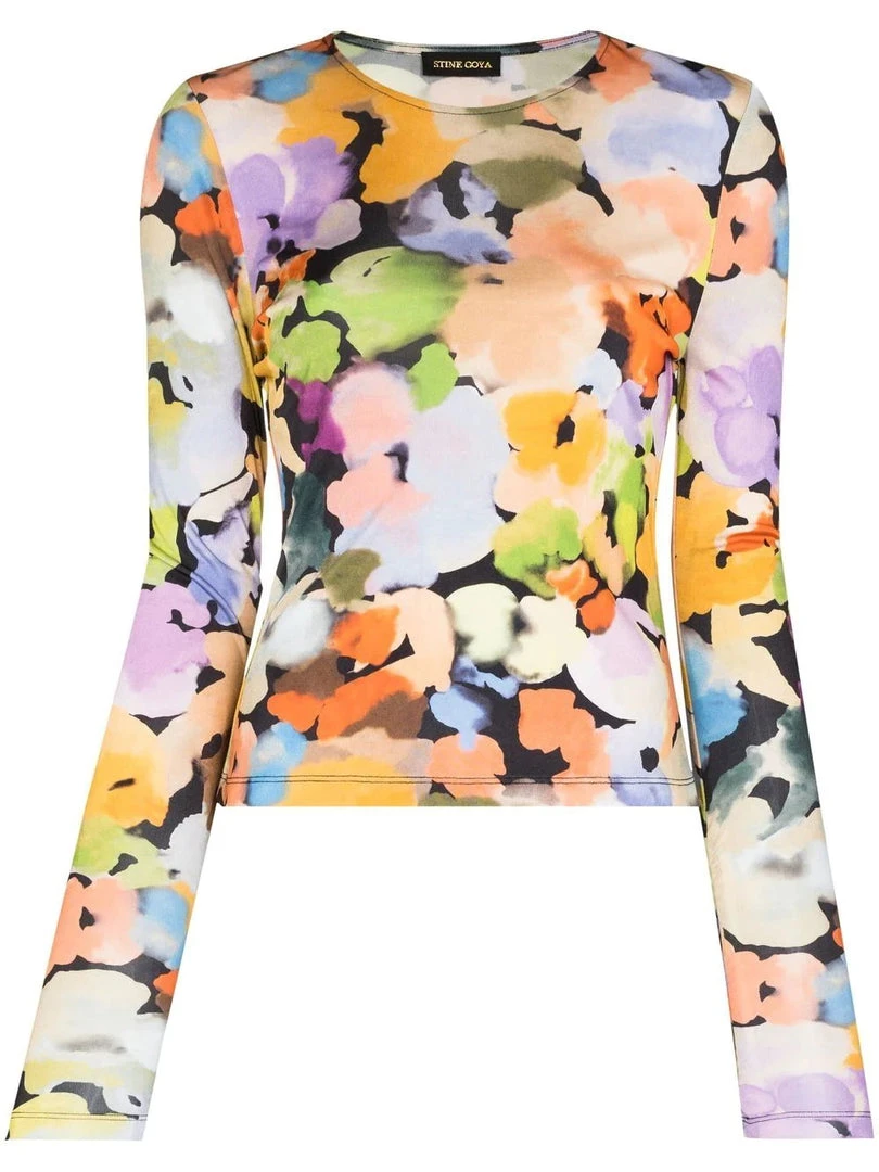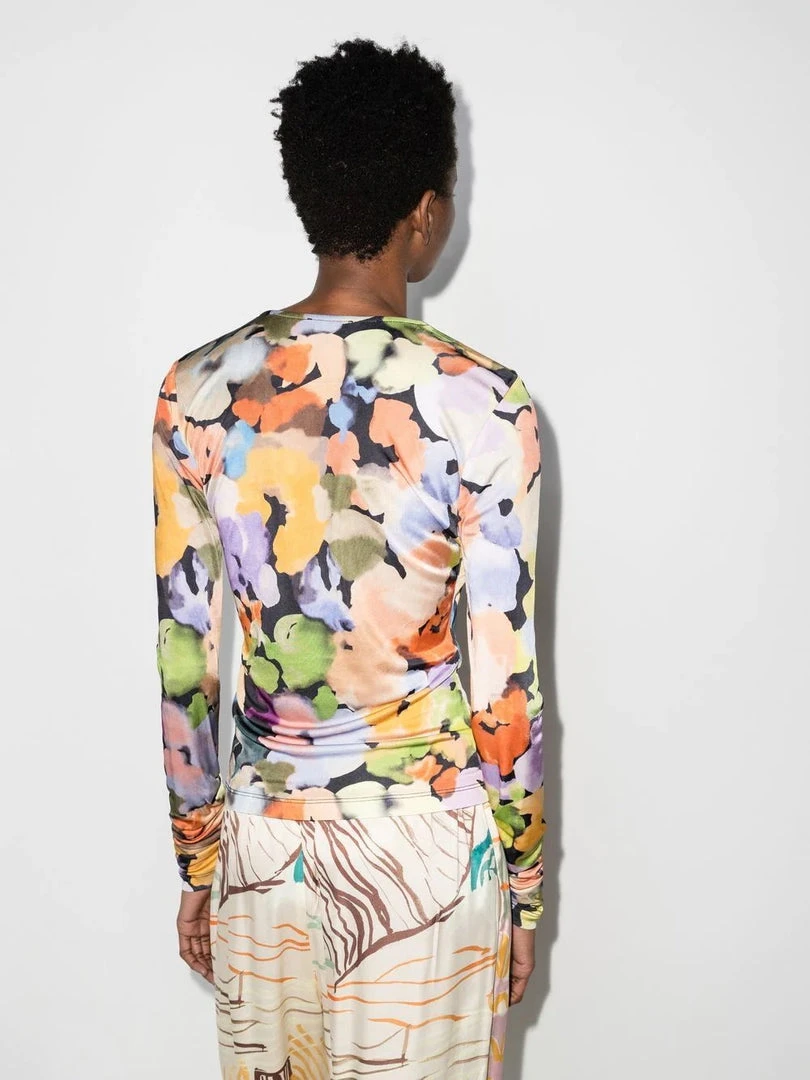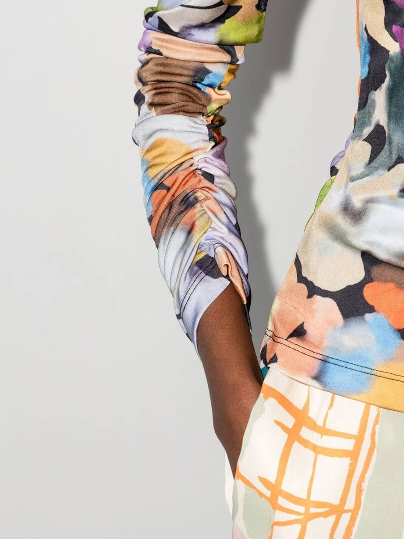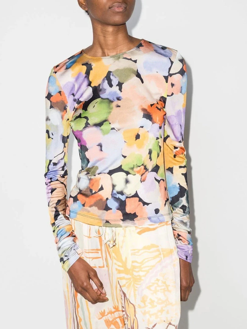 Stine Goya multicoloured ‘Nova’ top featuring a round neck, long sleeves with ruched detailing, an abstract floral print and pulls on. Item fits true to size. Model is wearing a size S.