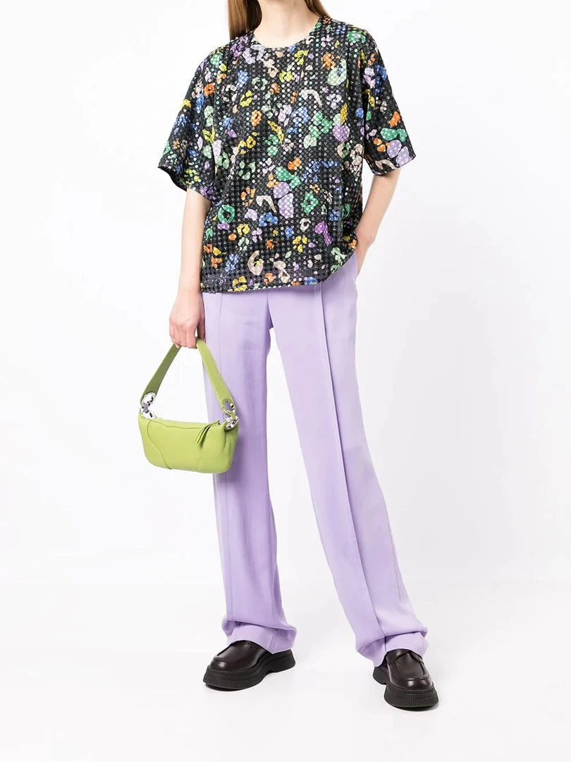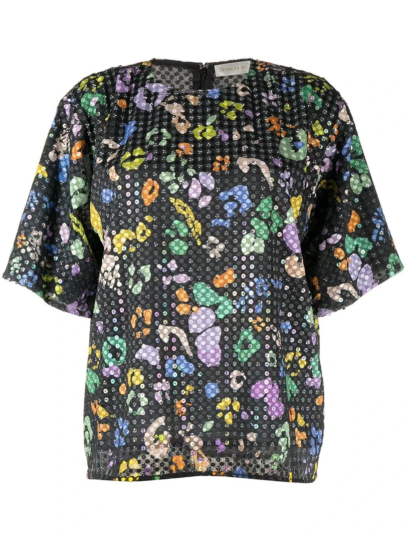 Stine Goya black oversized ‘Katalindi’ sequin leopard T-shirt featuring a round neckline, a back zip, hook and eye fastening, short sleeves, a multicoloured leopard print, round iridescent sequin and embroidered details and a boxy fit. Model is wearing a size XS.Â