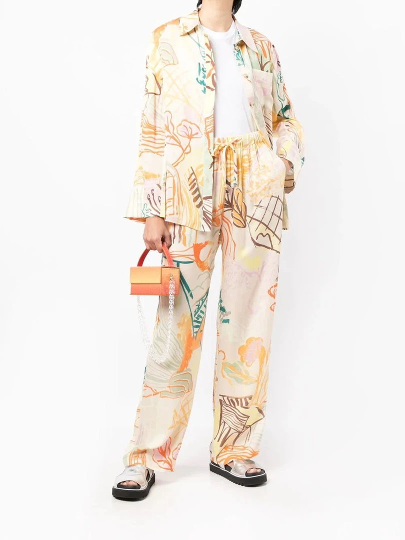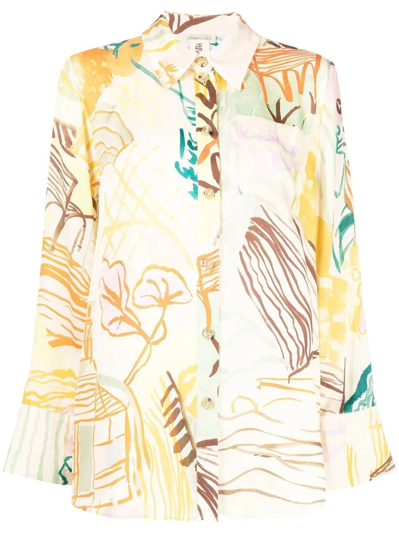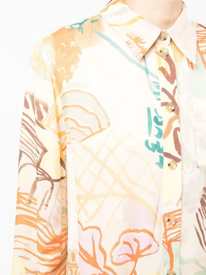 Stine Goya cream ‘Summer’ printed shirt featuring a classic collar, front button fastenings, long sleeves, a front chest patch pocket and a multicoloured Picasso style print. Item fits true to size. Model is wearing a size S.Â