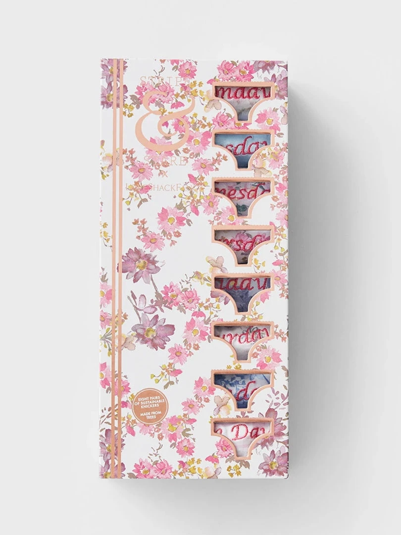 Stripe & Stare X Love Shack Fancy ‘Days Of The Week Knicker Box’ featuring 8 multicoloured patterned knickers with pink embroidered days of the week details on the front and lace trimming. Sustainably sourced. Flat-lock stitching ensures no PVL. Comes in a floral gift box. Items fit true to size. Model is wearing a size S.