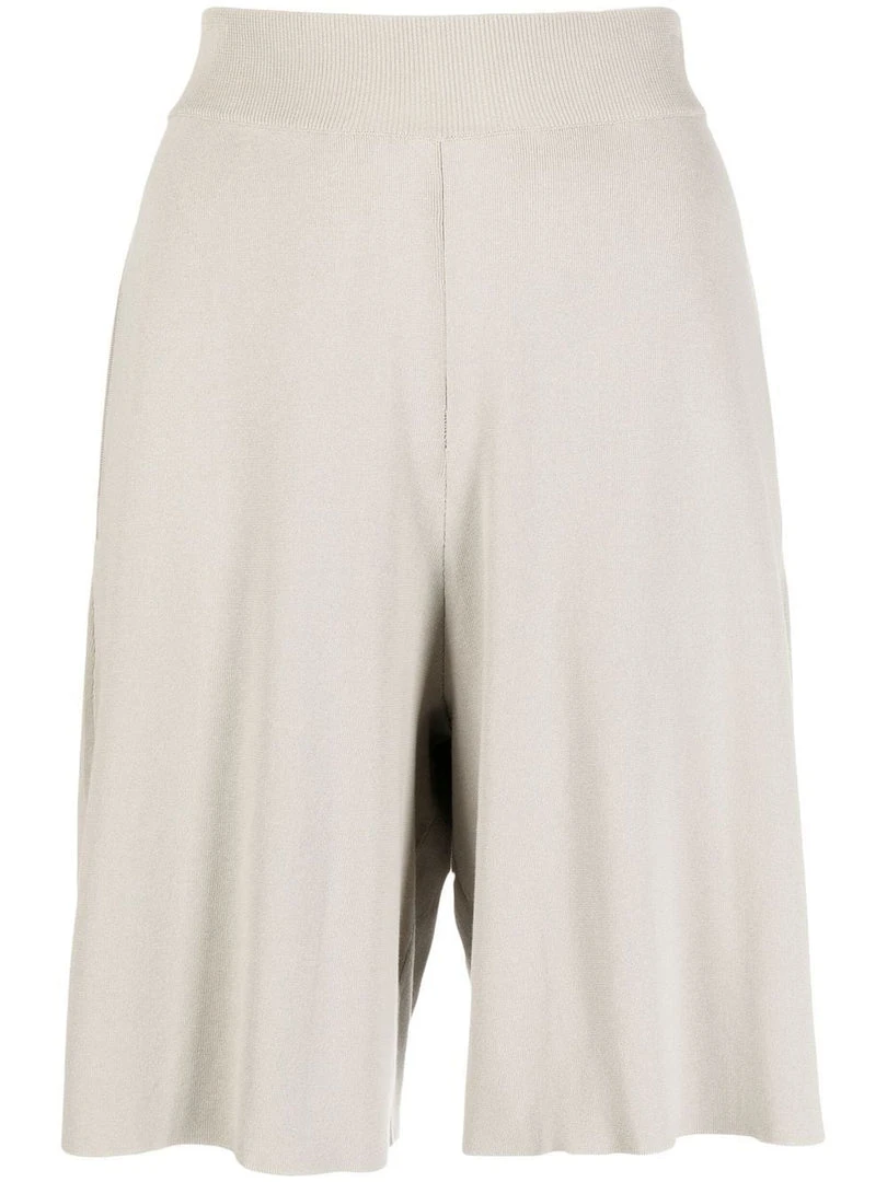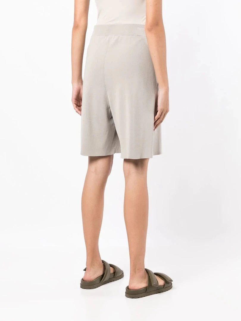 Studio Nicholson khaki ‘Anthos’ knitted shorts featuring a high waist fit, an elasticated waistband, side slip pockets, a long length and pulls on. Item fits true to size. Model is wearing a size 0.