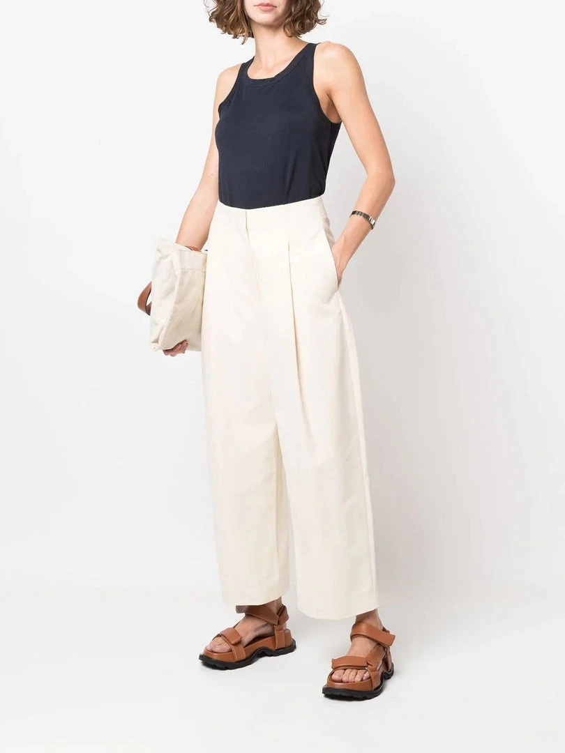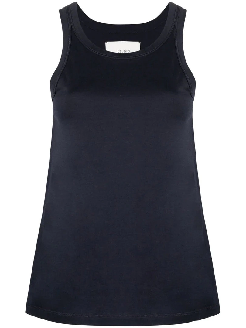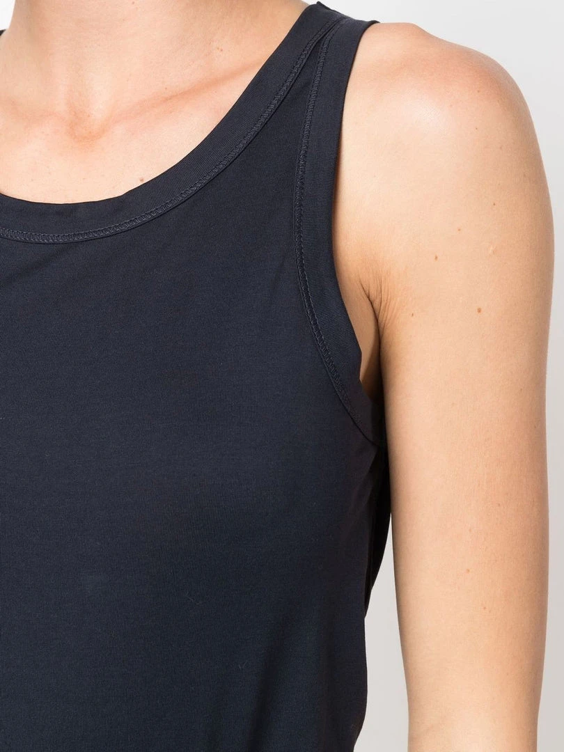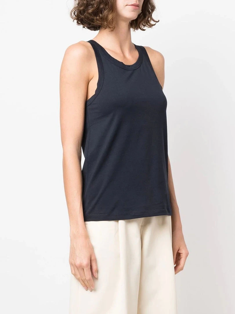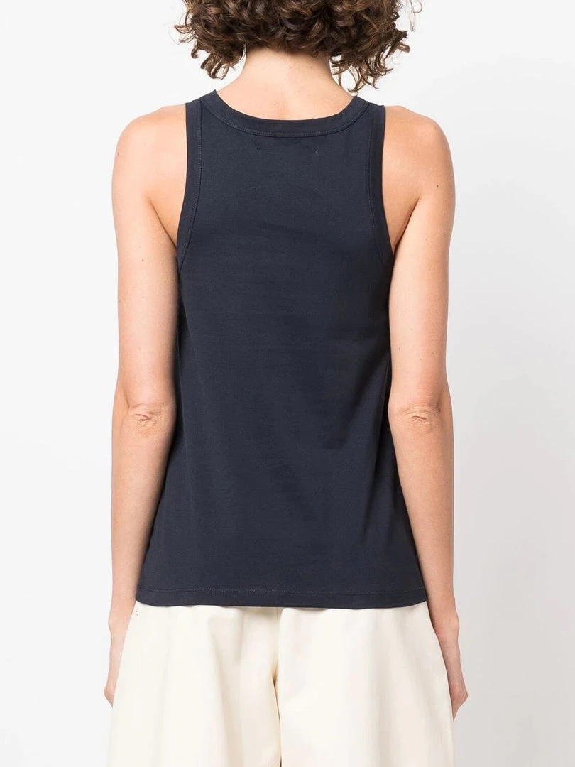 Studio Nicholson navy ‘Circa’ jersey racer vest featuring a round neck, a sleeveless design and pulls on. Item fits true to size. Model is wearing a size 0.