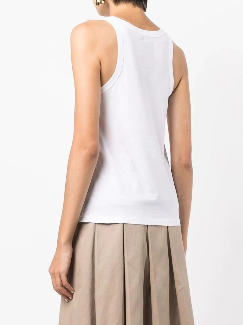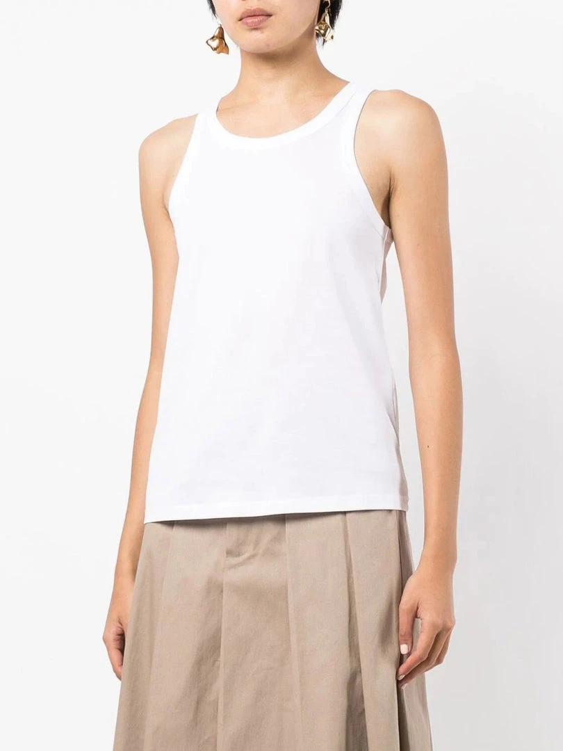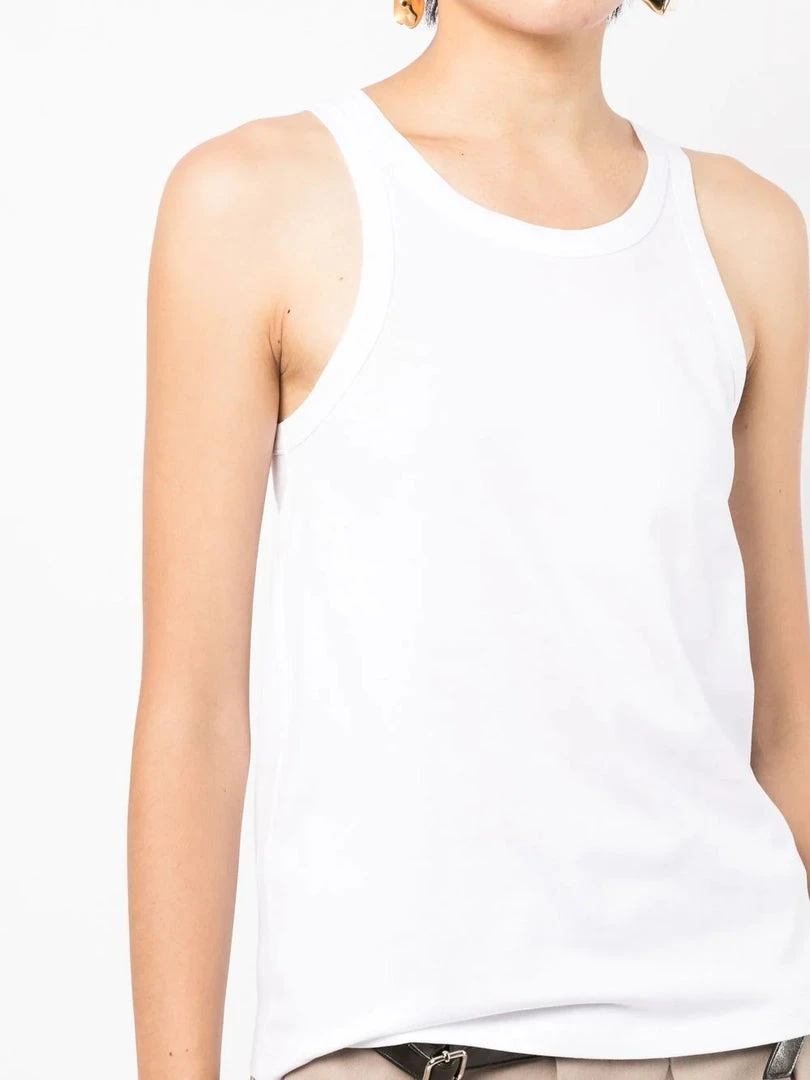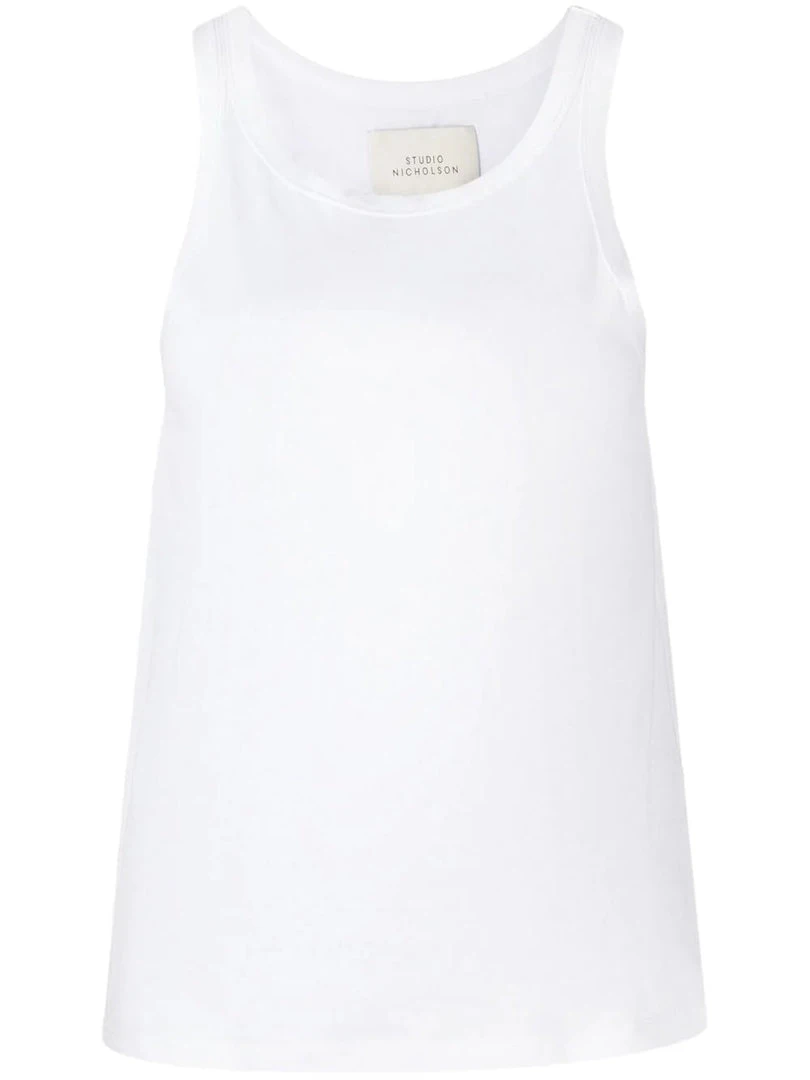 Studio Nicholson white ‘Circa’ jersey racer vest featuring a round neck, a sleeveless design and pulls on. Item fits true to size. Model is wearing a size 0.