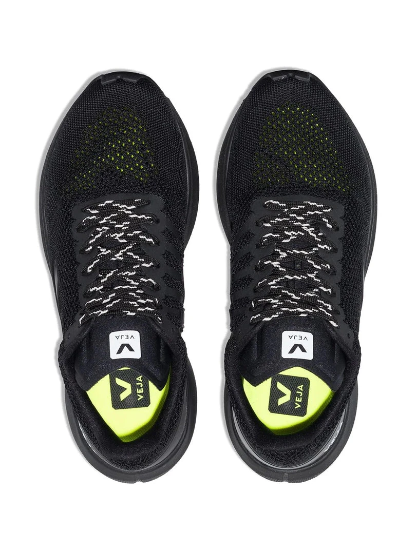 Veja black ‘Marlin LT V-Knit Trainers’ featuring a round toe, a contrasting lace up fastening, a branded tongue, insole and heel counter, a signature ‘V’ to the side, a rubber sole and a knitted top design. Made in Brazil. Item fits true to size. European Sizing.