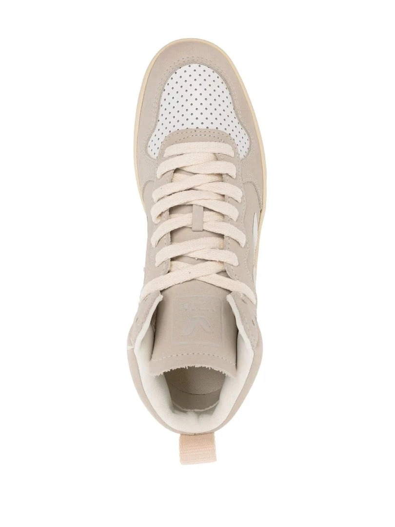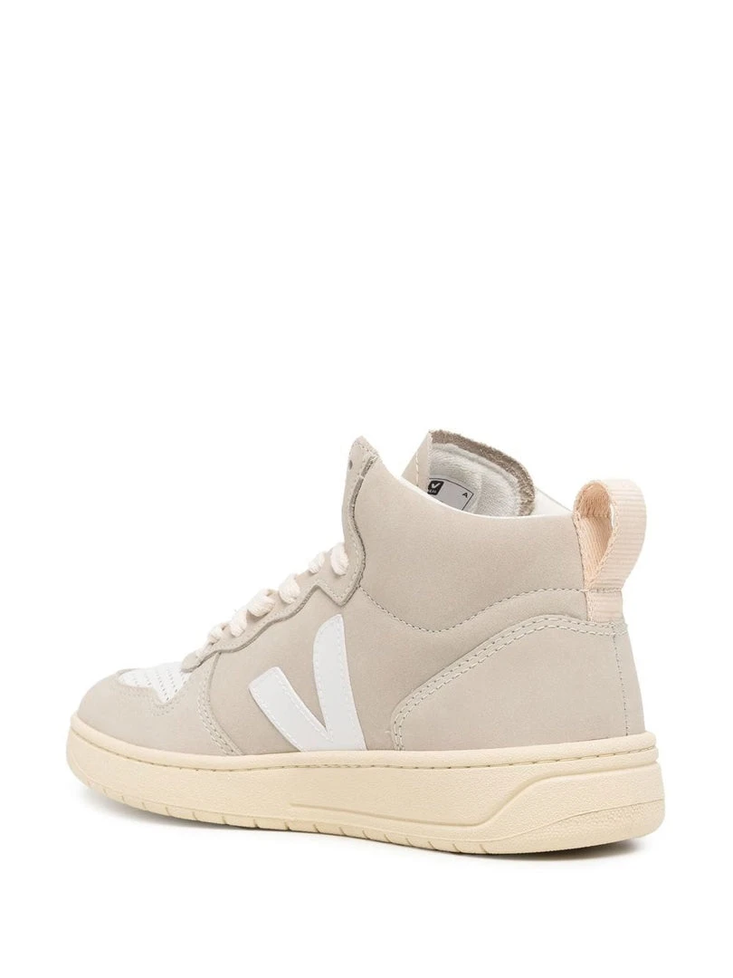 Veja ‘V-15’ Nubuck beige trainers featuring a round and perforated toe, a lace up fastening, contrasting white signature ‘V’ side details, a branded tongue and insole, a pull tab at the rear and a high top style. Made in Brazil. Item fits true to size. European Sizing.