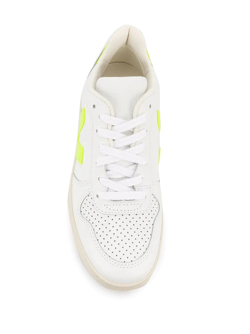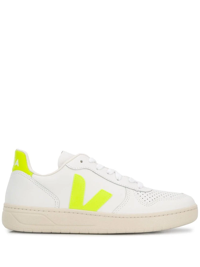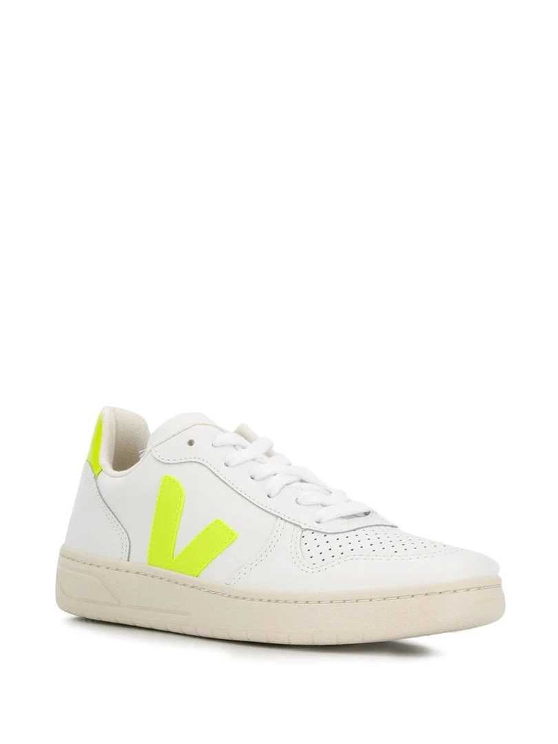 Veja white and neon yellow ‘V-10’ low-top trainers featuring a round, perforated toe, a front lace up fastening, contrasting logo details on the sides and rear heel counter, a branded insole and an embossed logo detail on the tongue. Item fits true to size. Made in Brazil. European Sizing.