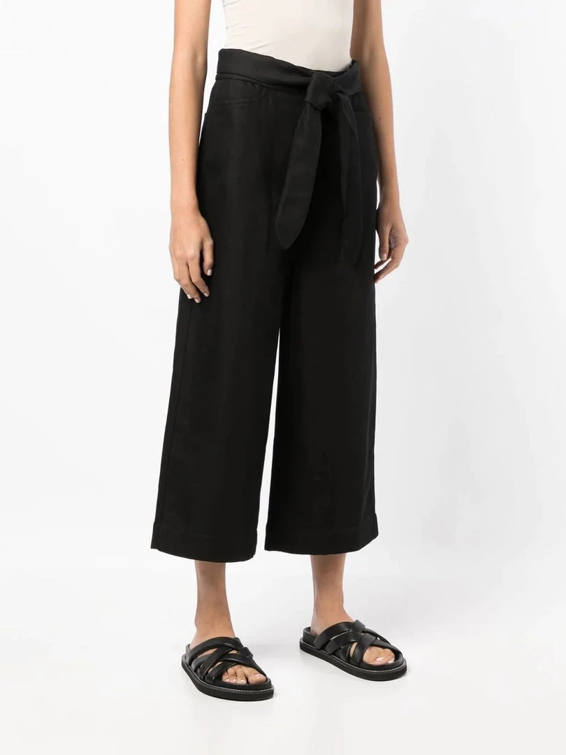 Vince black ‘Tie Front Wide Leg Trousers’ featuring front hook and zip fastenings, a fold-over tie front detail, a four pocket design, a cropped wide leg fit and a high rise style. Item fits true to size. Model is wearing a size 4 US.Â
