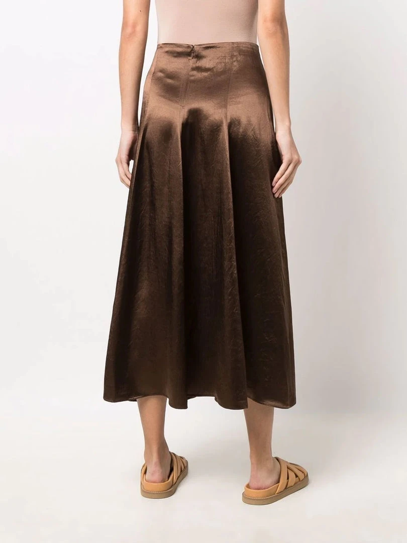 Vince brown ‘Panelled Satin Slip Midi Skirt’ featuring a back zip fastening, an A-line shape, a high waist style and a midi length. Item fits true to size. Model is wearing a size 4 US.Â