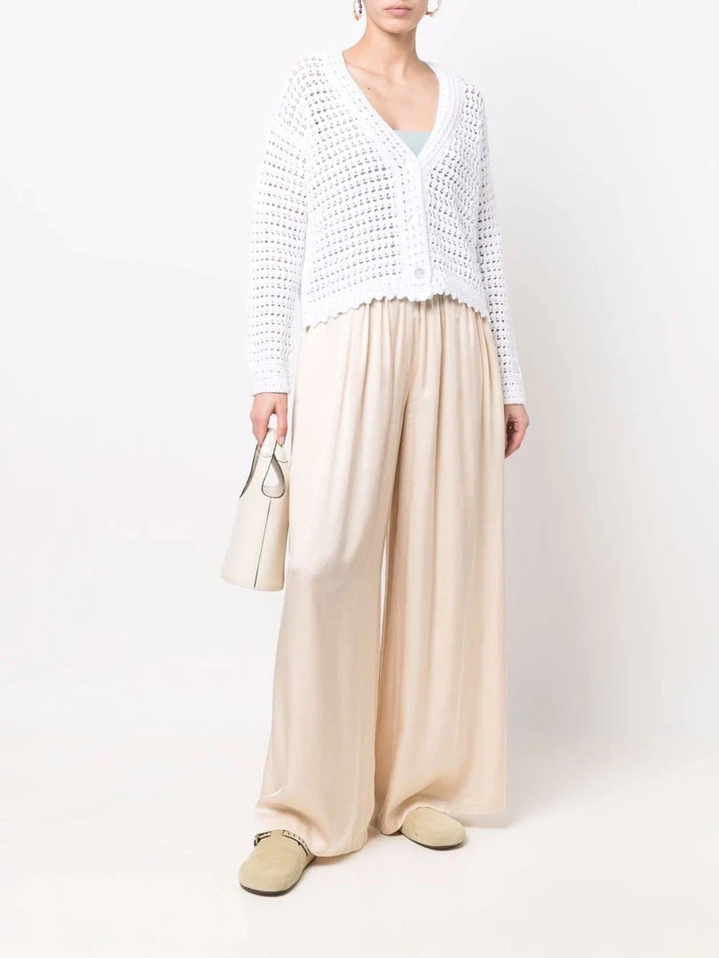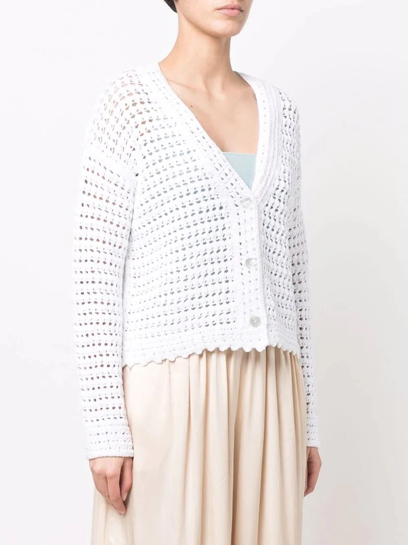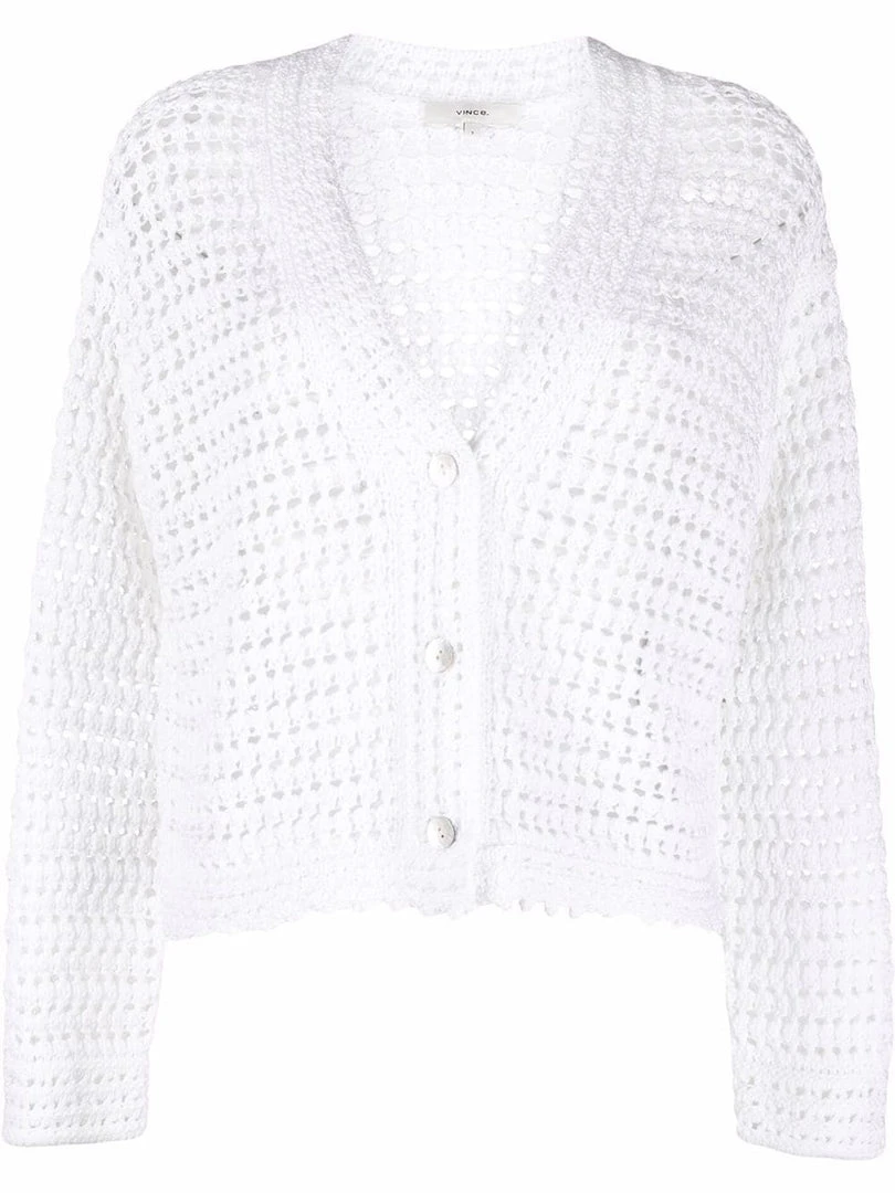 Vince white ‘Crochet Cardigan’ featuring a v-neckline, front button fastenings, long sleeves and an open knit design. Item fits true to size. Model is wearing a size S.