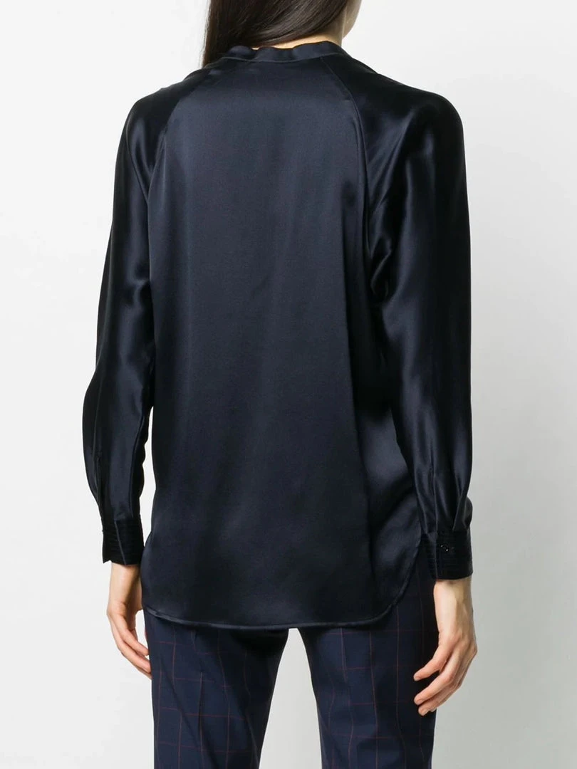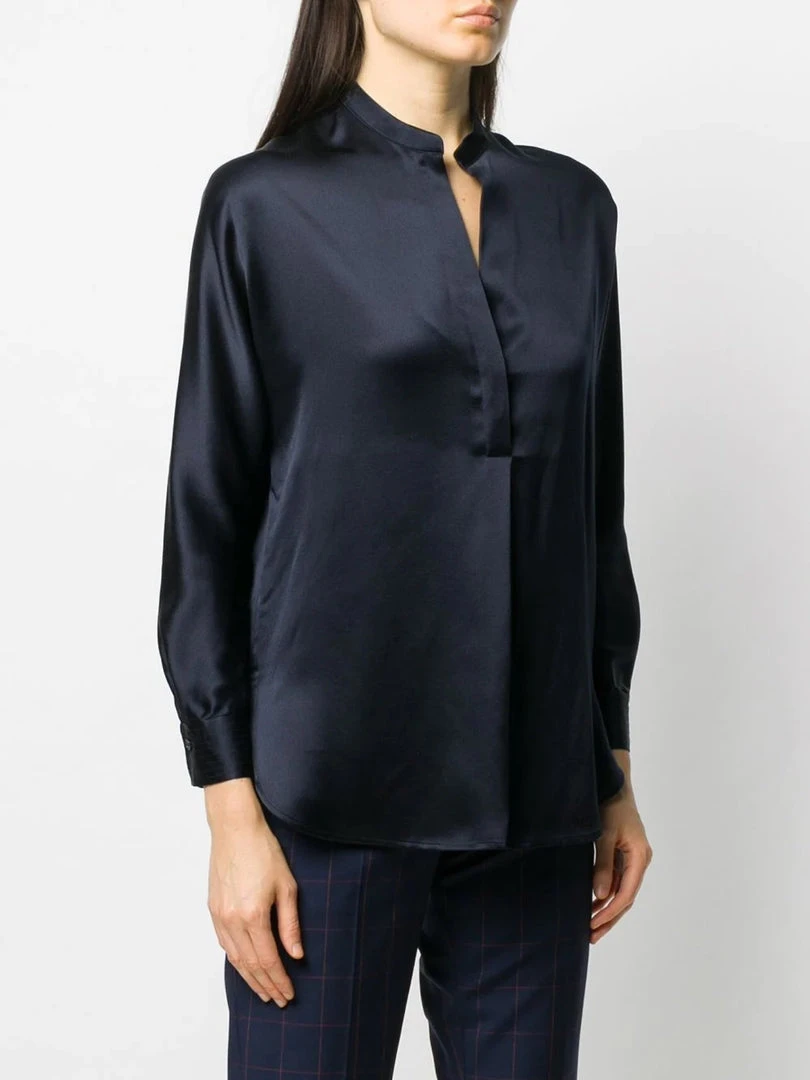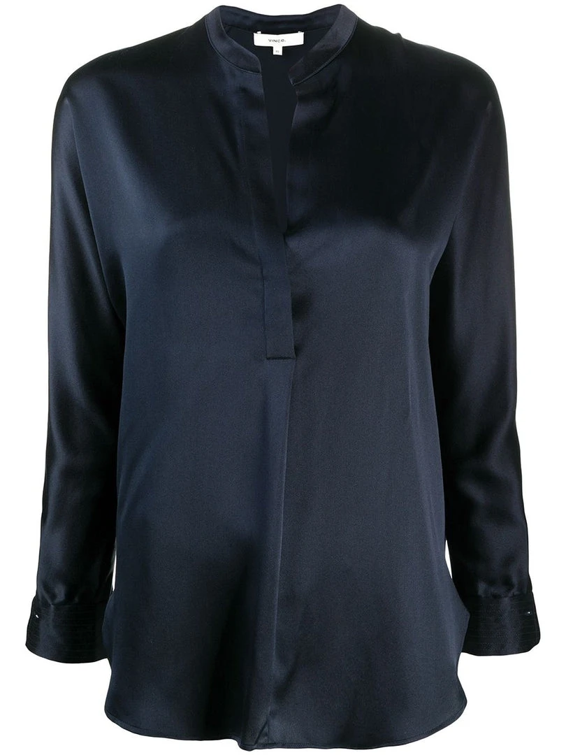 Vince navy ‘Silk Open Front Blouse’ featuring long sleeves with buttoned cuffs, side slits, a curved hem, a relaxed fit and pulls on. Item fits true to size. Model is wearing a size XS.
